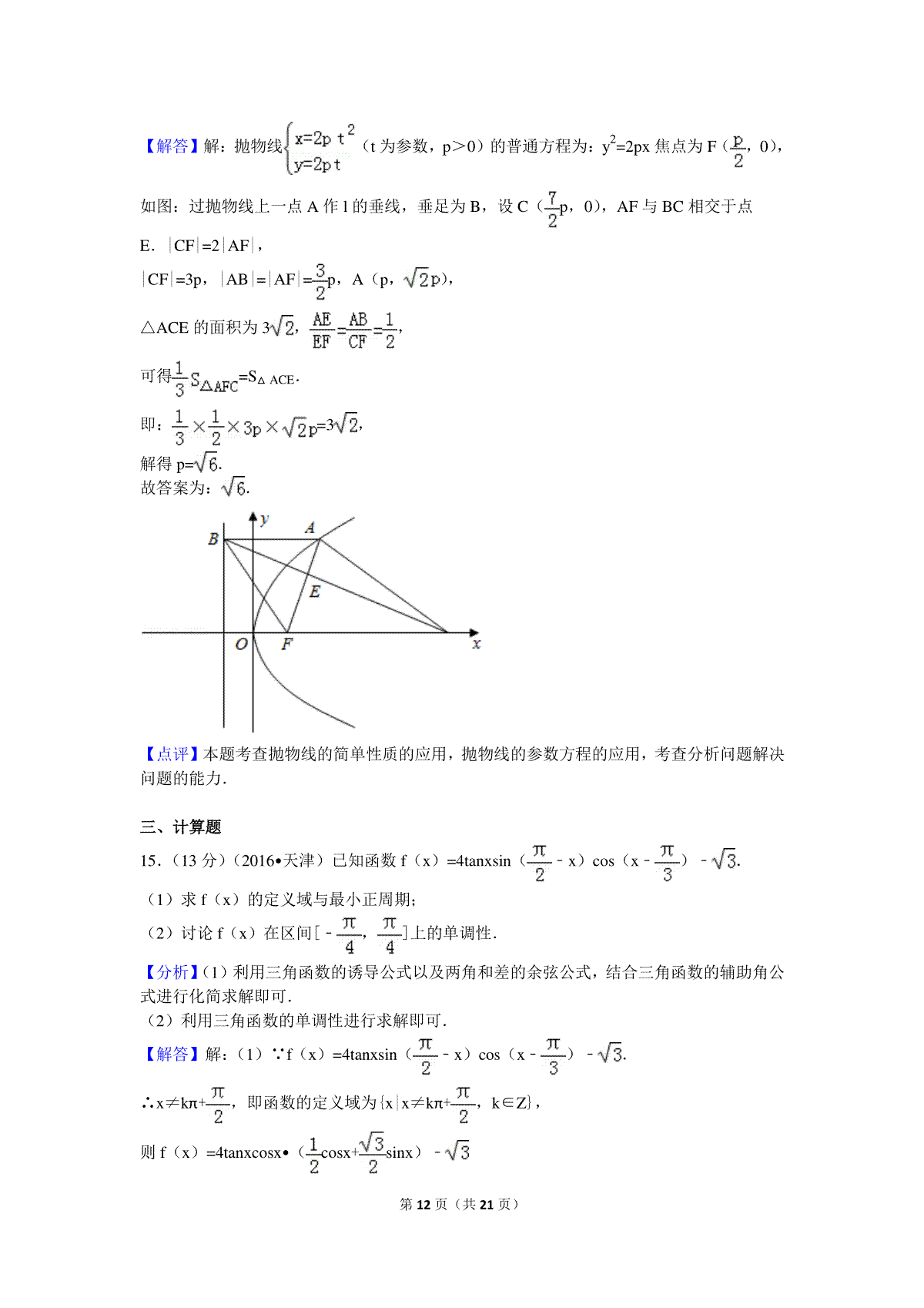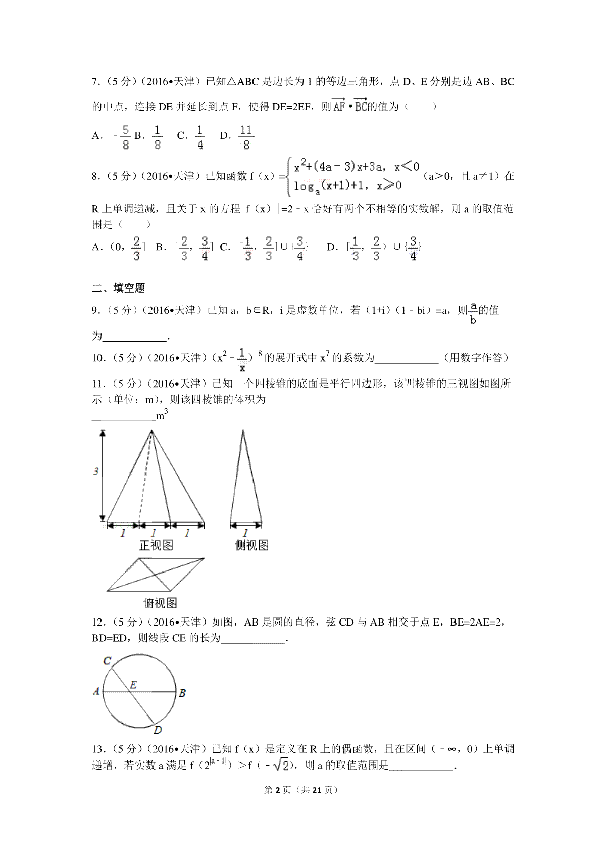 一、2016年高考理科数学试题(天津卷)及参考答案