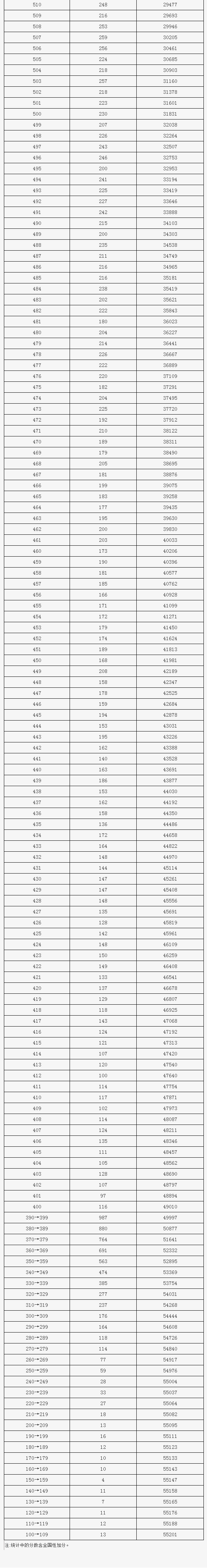 北京高考一分一段是以“1分”为单位,统计获得该分数的考生人数和累计人数(也有的省份是5分一段,如广东)。文理科分开排名,每一个分数段上有多少人一目了然。通过这个表,考生不仅知道各批次的分数线,同时还能了解自己在全省考生中的排位,更有利于考生对自己进行合理的定位。