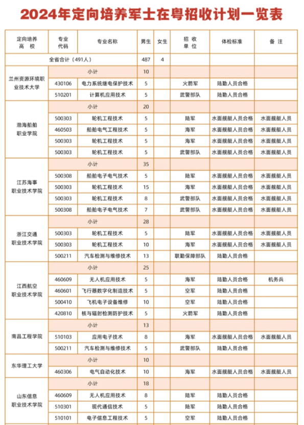 2024年广东省定向培养军士招收计划发布!今年有25所普通高校在广东省招收定向培养军士,计划为解放军和武警部队招收491人,其中女军士4人。更多广东高考定向培养军事招收计划相关内容,往下看吧。