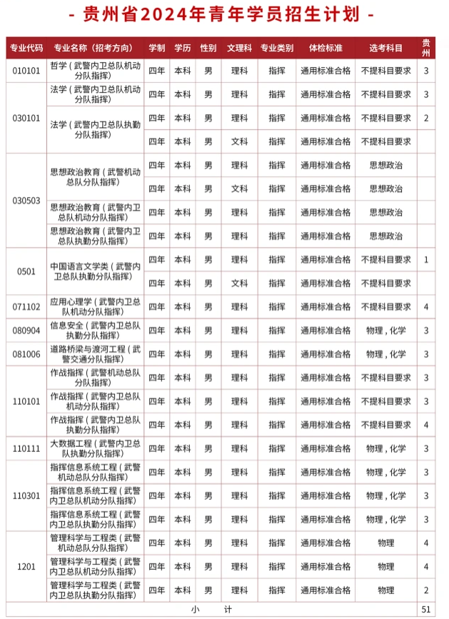2024年在贵州武警警官学院总计划招收51人,详细各专业招生计划如下: