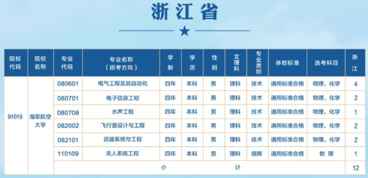 2024年在浙江海军航空大学总计划招收12人,详细各专业招生计划如下: