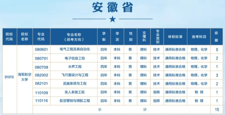 2024年在安徽海军航空大学总计划招收15人,详细各专业招生计划如下: