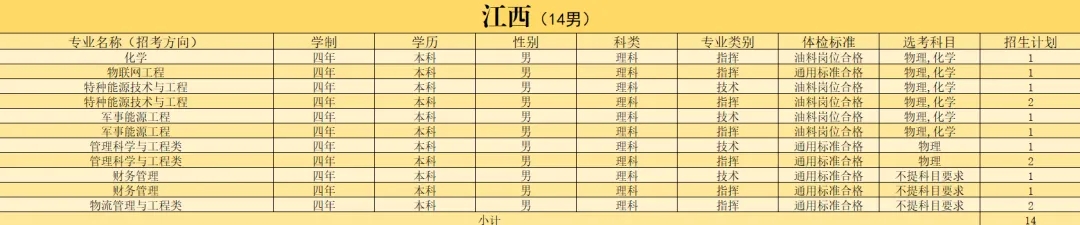 陆军勤务学院2024年在江西招收生长军官本科青年学员共计14人。其中指挥类10人(男生10人),技术类4人(男生4人)。
