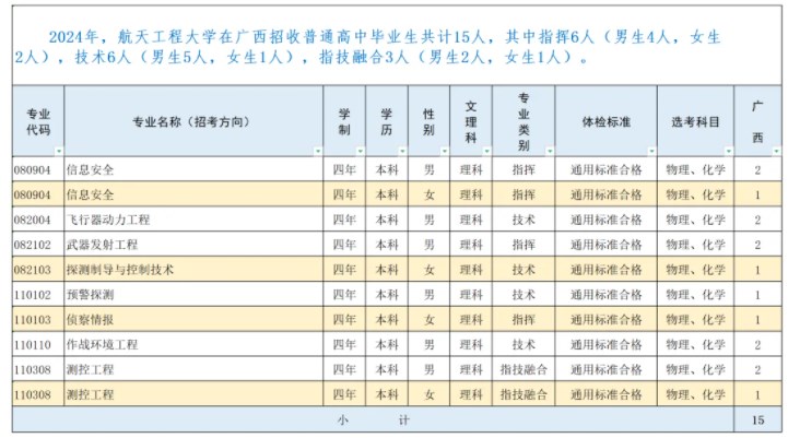 2024航天工程大学在广西招生计划:测控工程专业计划招生3人;预警探测专业计划招生1人。以下是详细内容,大家可以看一看。
