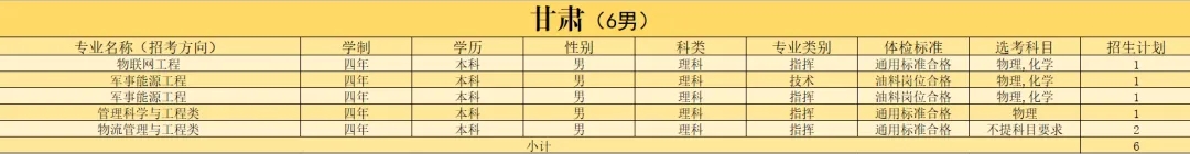 陆军勤务学院2024年在甘肃招收生长军官本科青年学员共计6人。其中指挥类5人(男生5人),技术类1人(男生1人)。