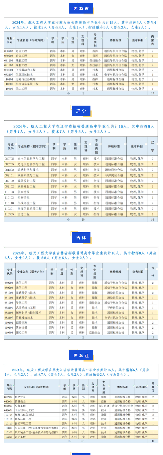 2024航天工程大学在各省招生计划:2024航天工程大学在北京招生计划人数是10人;2024航天工程大学在天津招生计划人数是10人。以下是详细内容,大家可以看一看。