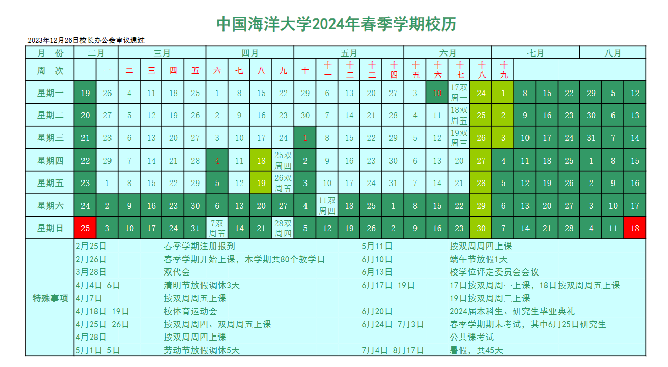 2024年中国海洋大学暑假放假安排确定,暑假放假时间是7月4日,中国海洋大学暑假开学时间是8月17日。暑假放假期间,可以学习一些和本专业相关的技能,或者去实习,提前进入社会,了解自己本专业可以做什么工作,也很有意义。