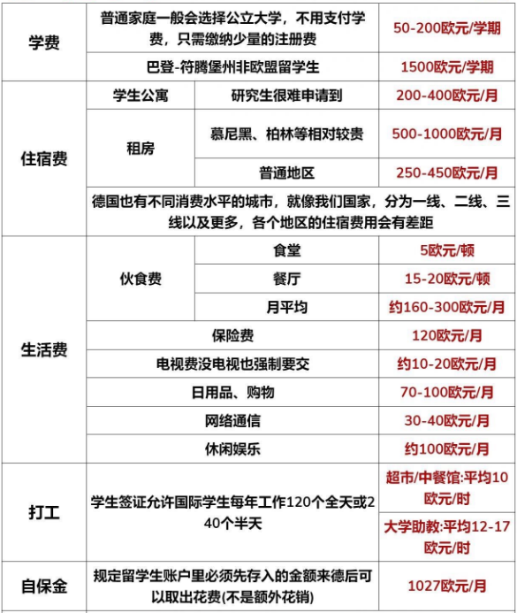 2.生活费:4000-5000欧元/年。包括吃住的费用,每个月租房子从150欧元到250欧元不等;