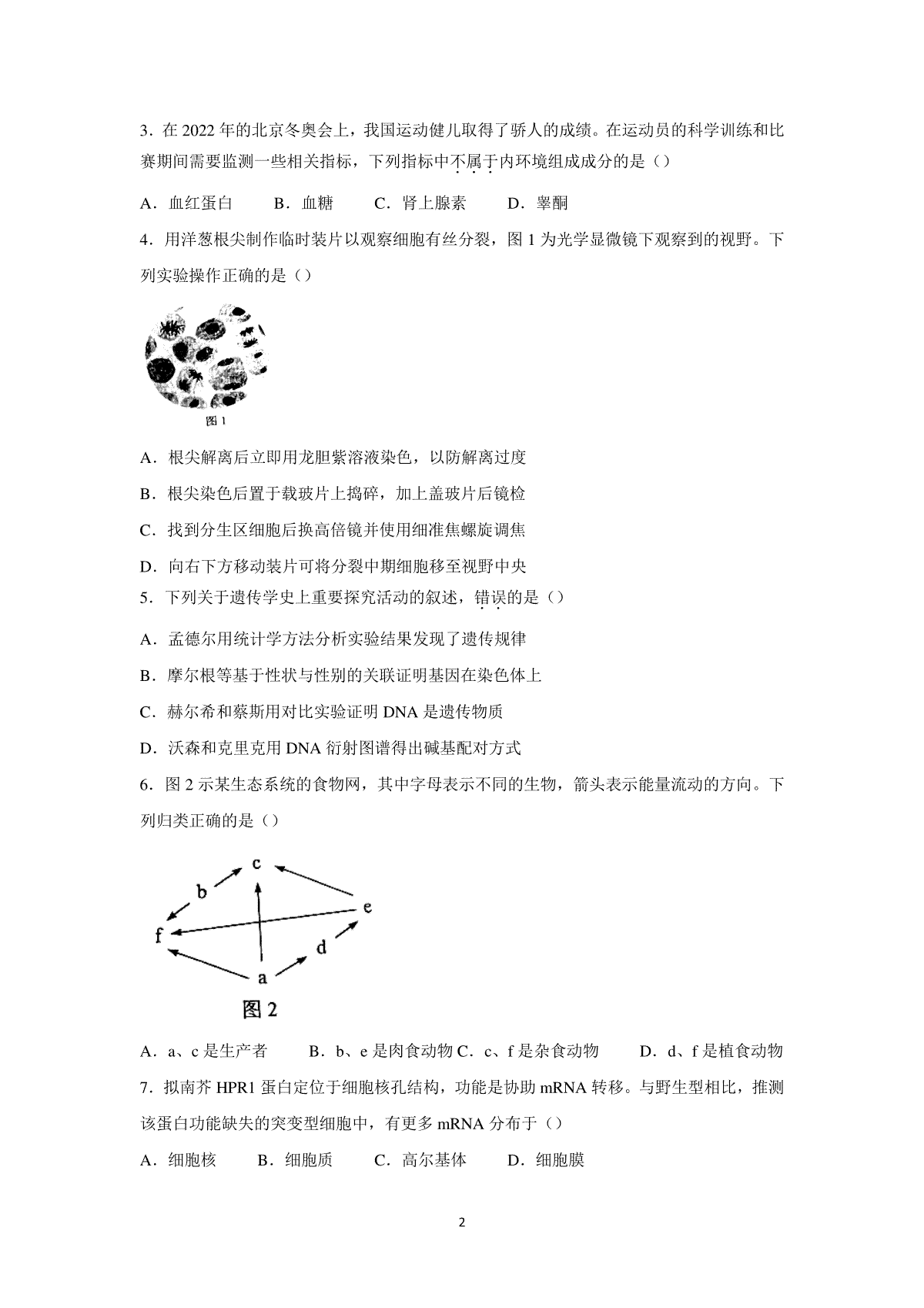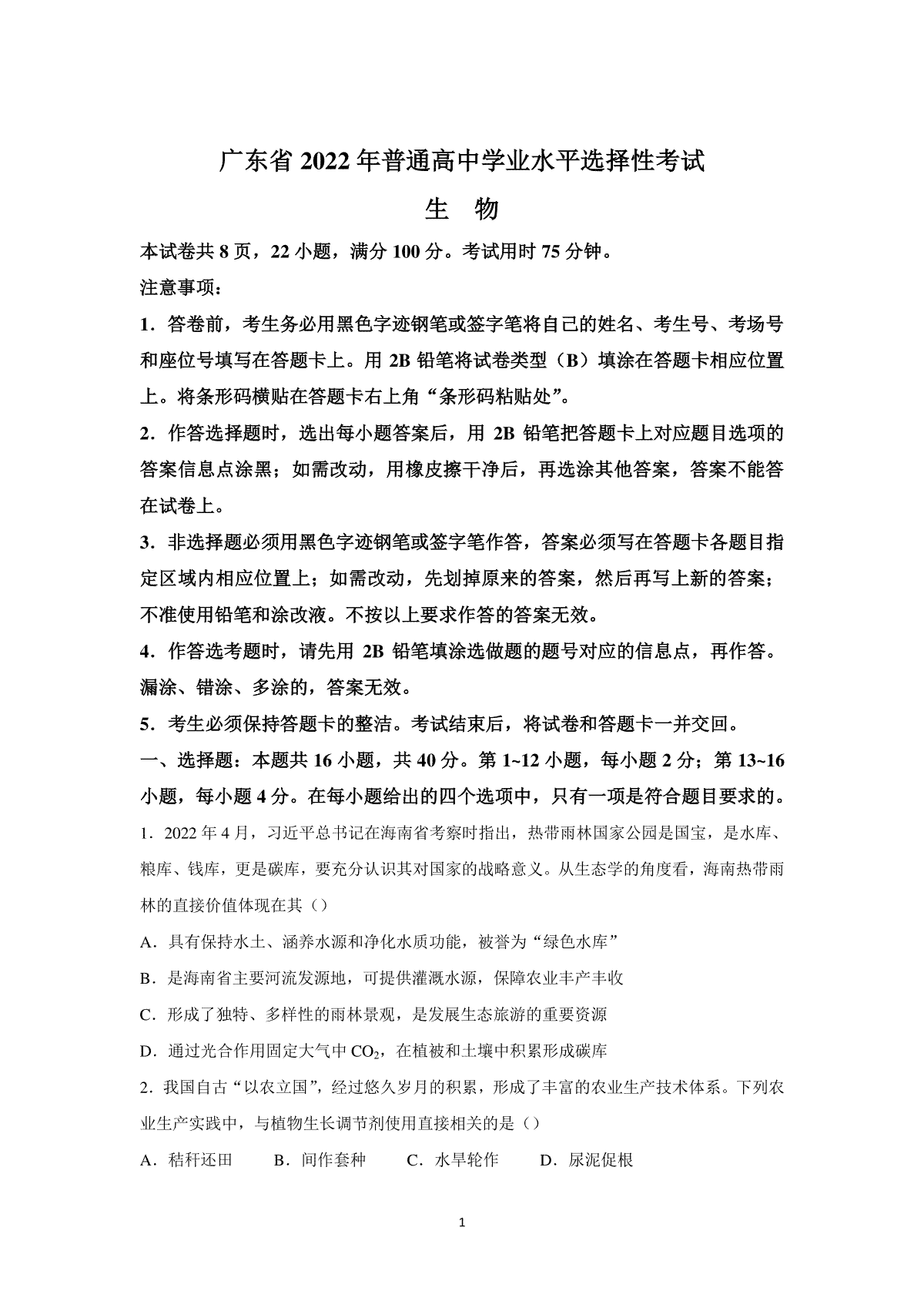 一、2022年高考真题——生物(广东卷) Word版(原卷)