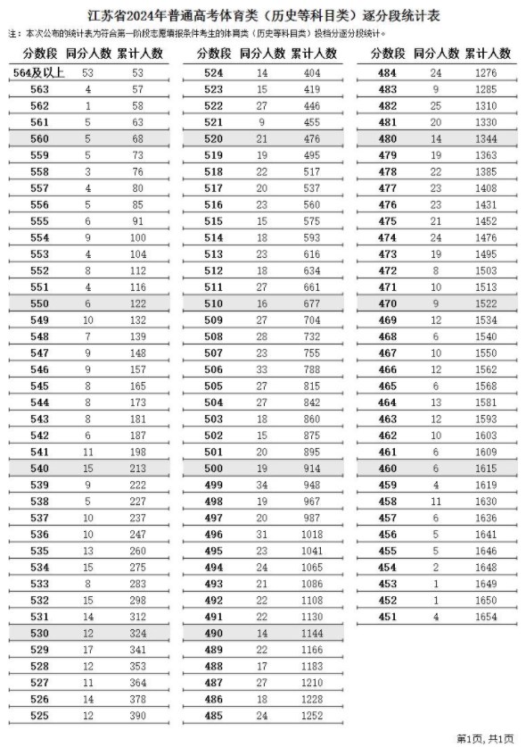 江苏2024高考体育类一分一段表已经发布,其中物理类575分累计人数是65人;570分累计人数是78人;536分累计人数是316人;534分累计人数是343人。以下是详细内容,大家可以看一看。