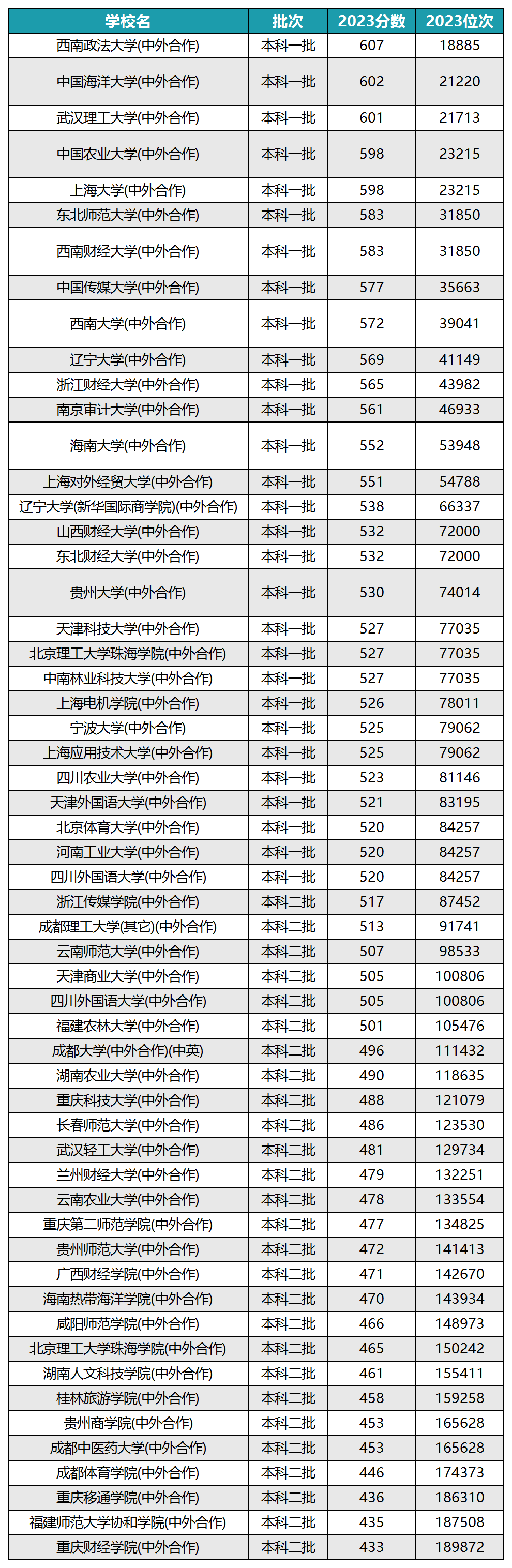 本科二批次录取中,收分最低的公办中外合作办学大学是成都体育学校(中外合作)446分,收分最低的民办中外合作办学是重庆财经学院(中外合作)433分。