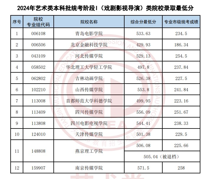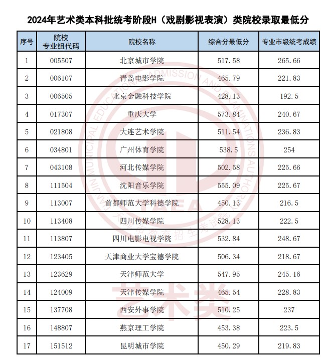1.天津2024艺术类本科批统考院校录取最低分(表(导)演类)