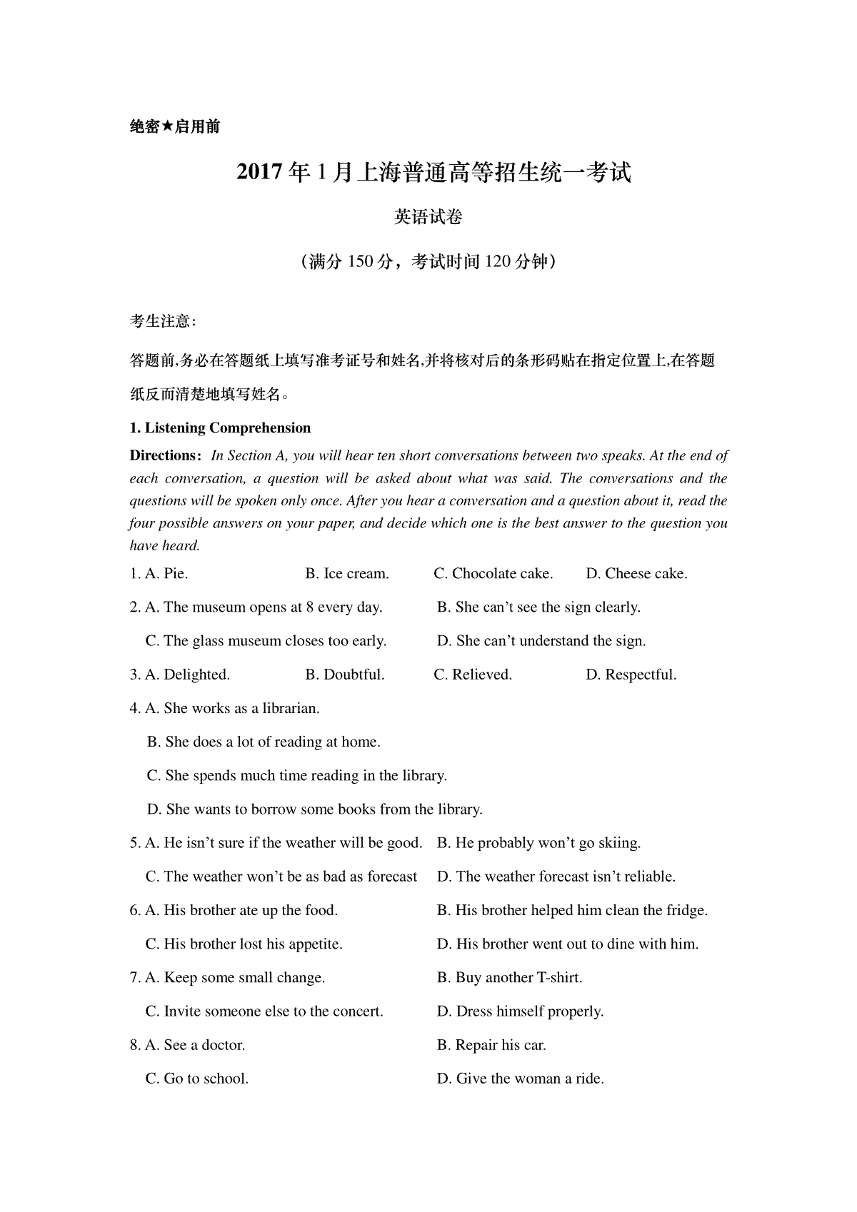一、2017年上海高考春季英语真题试卷(word原卷版)