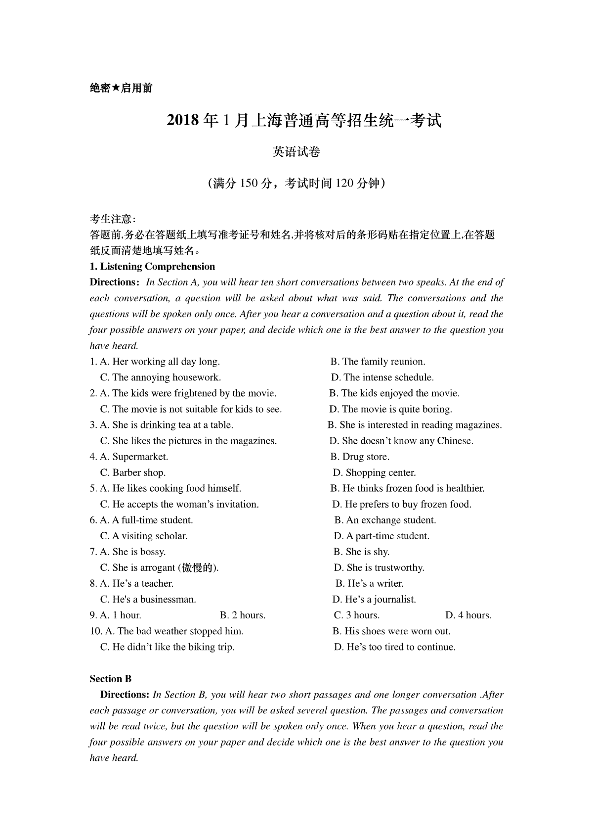 一、2018年上海高考春季英语真题试卷及答案(word版)