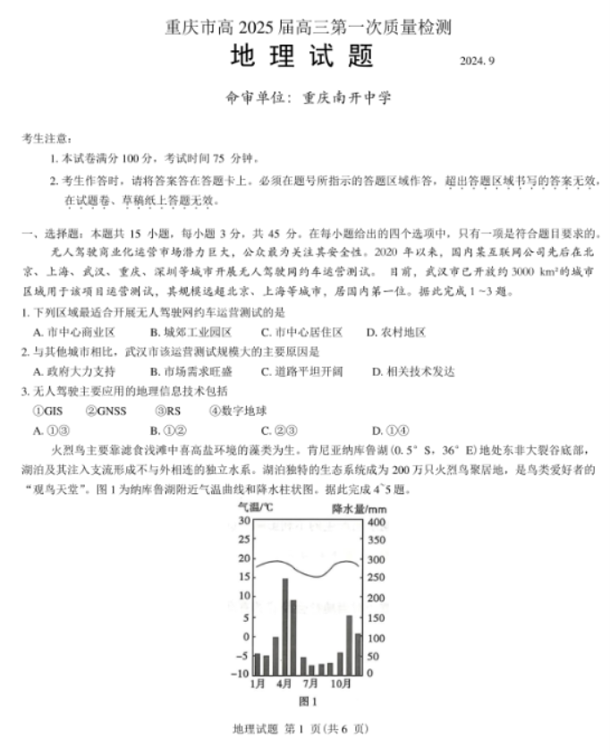 重庆市南开中学高2025届高三第一次质量检测地理试题及答案解析