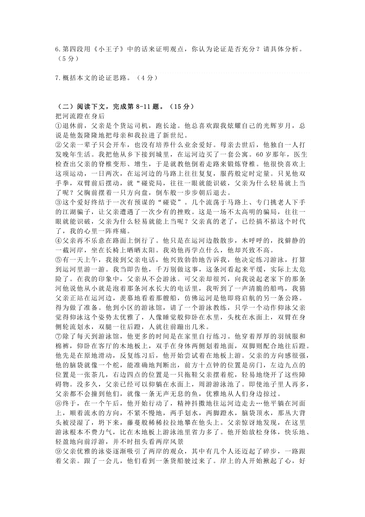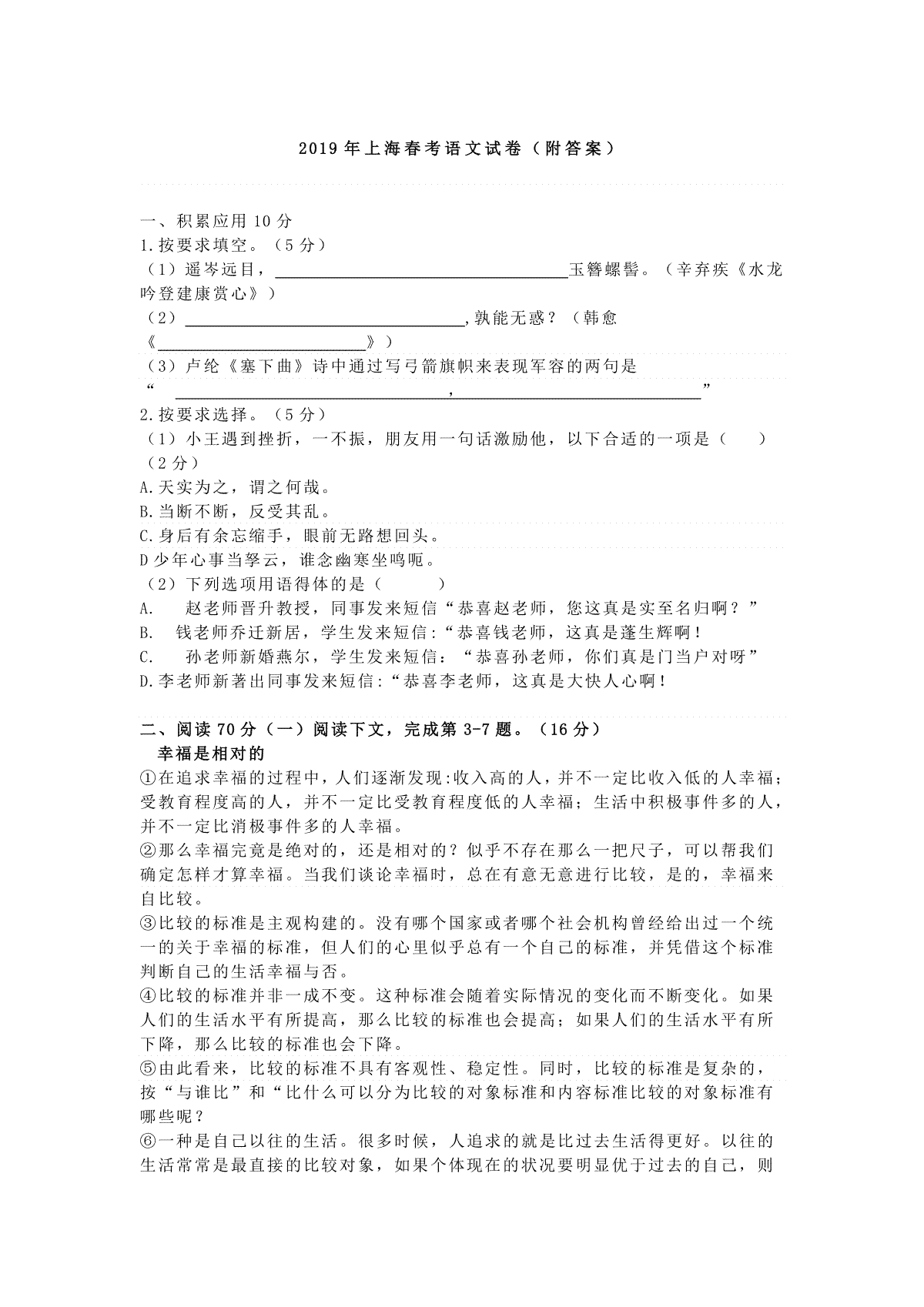 一、2019上海春考语文试卷 (原卷版)