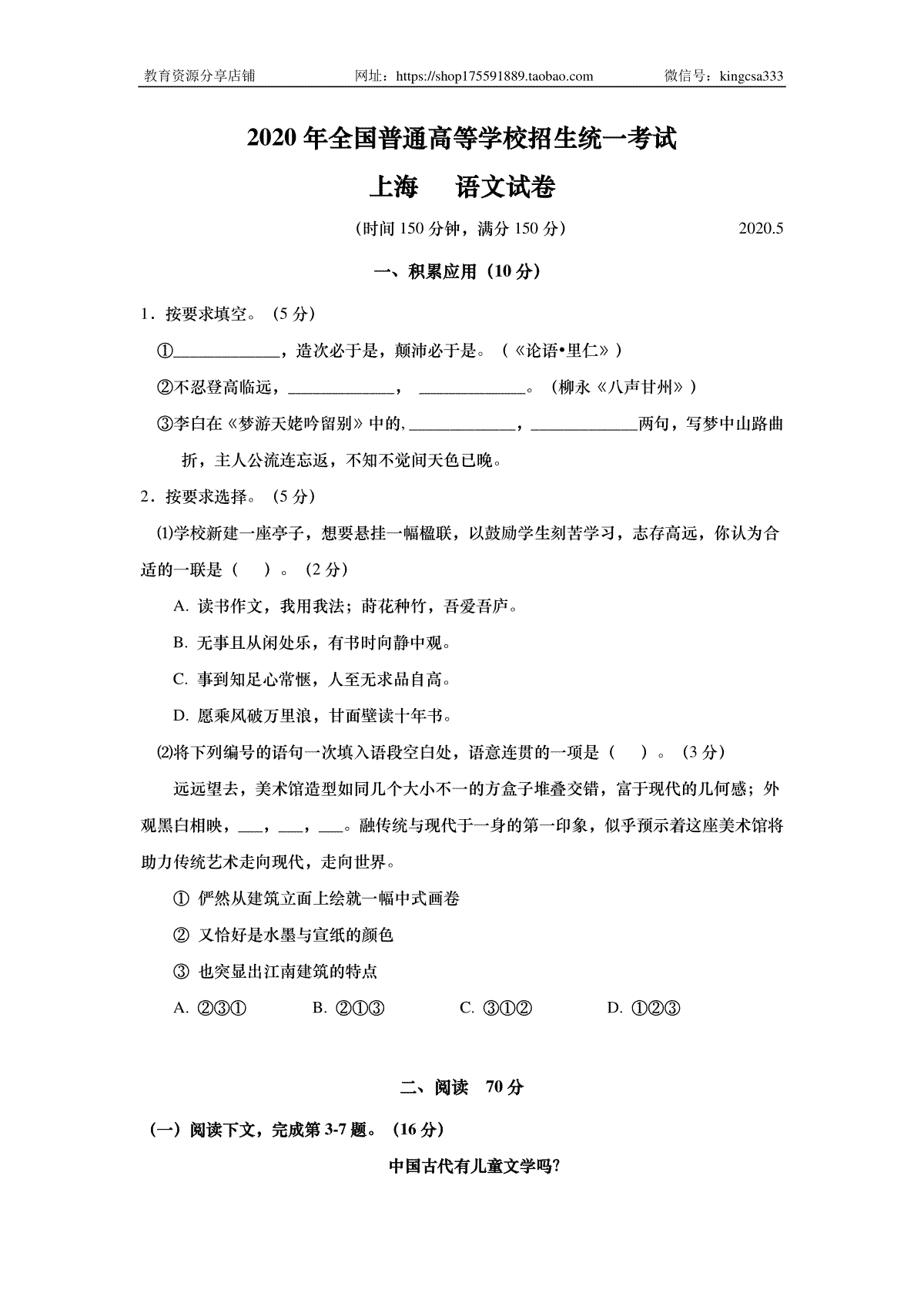 一、2020年上海高考语文真题试卷(答案版)