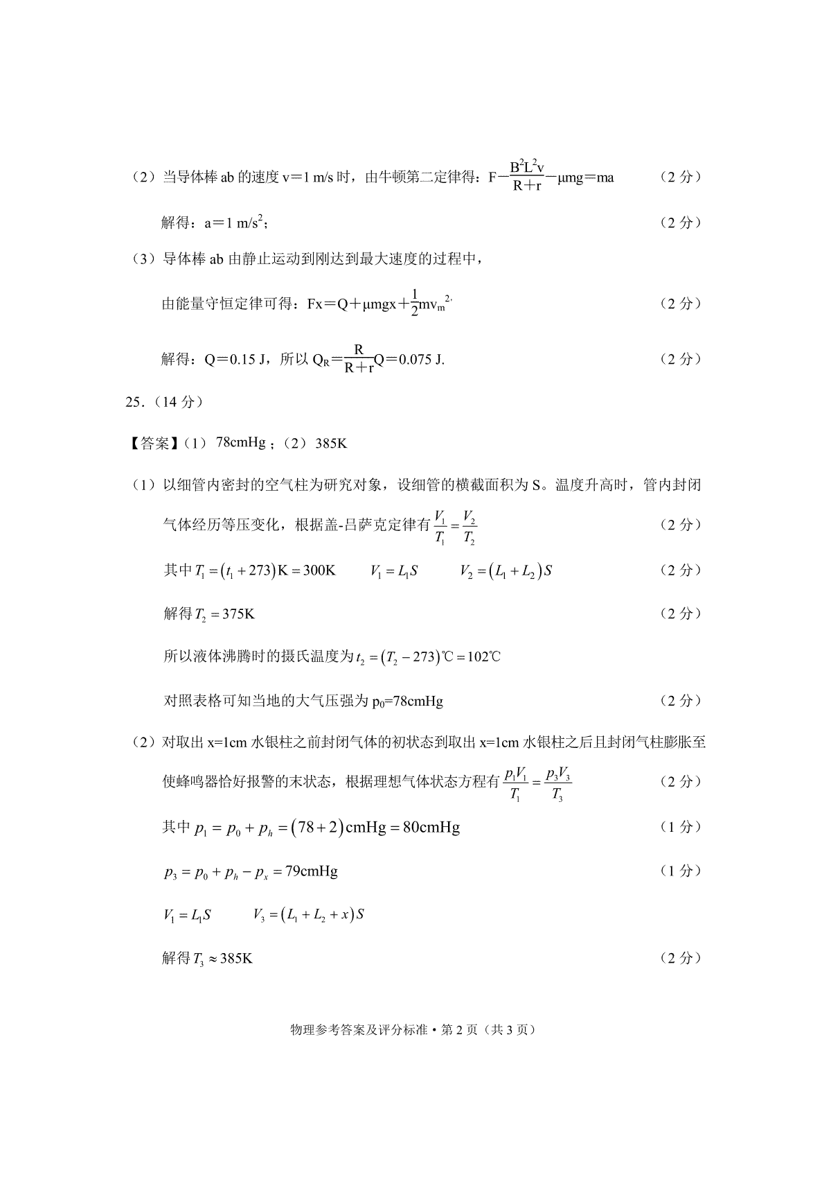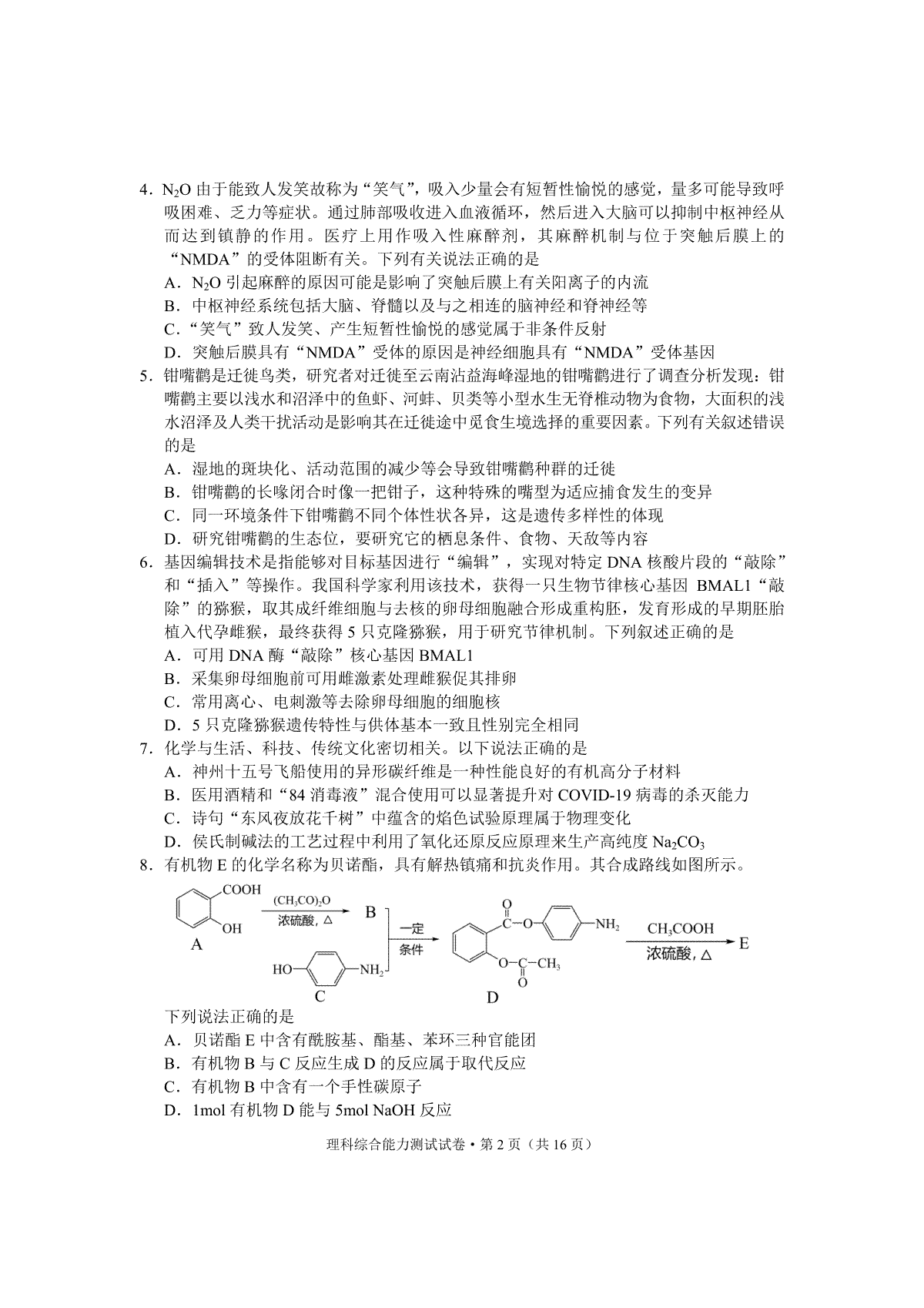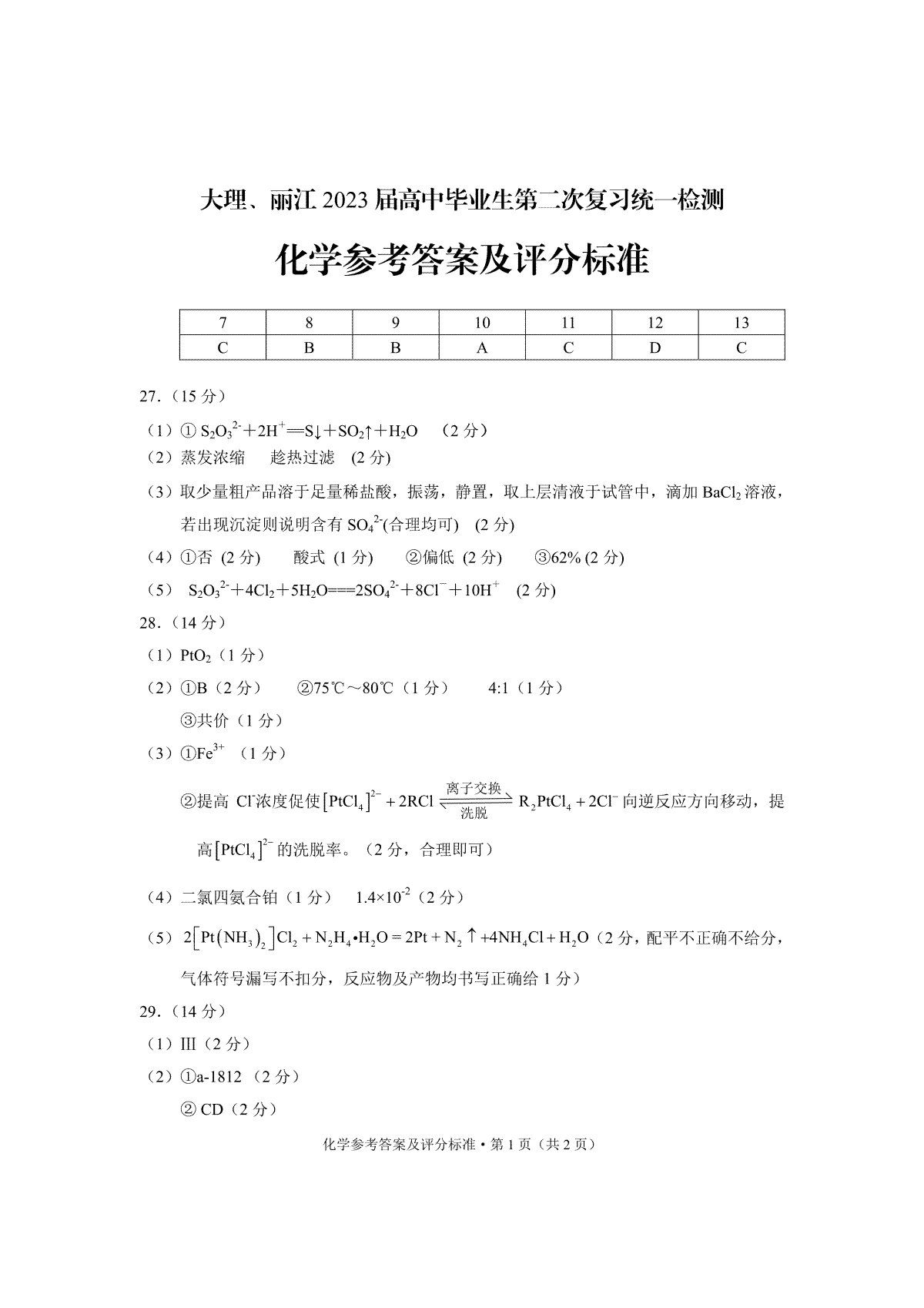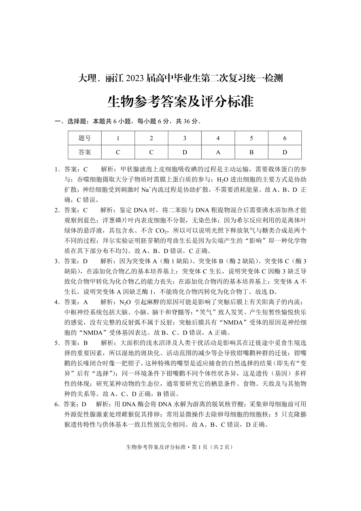 一、大理、丽江2023届高中毕业生第二次复习统一检测理综