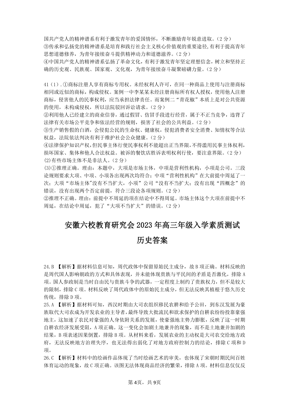 一、安徽省六校教育研究会 2023 年高三年级入学素质测试六校联考文综答案