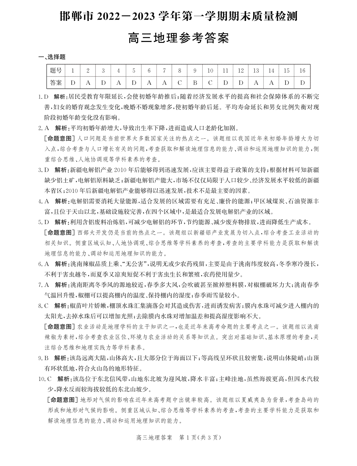 一、邯郸市2022-2023学年第一学期期末质量检测地理答案