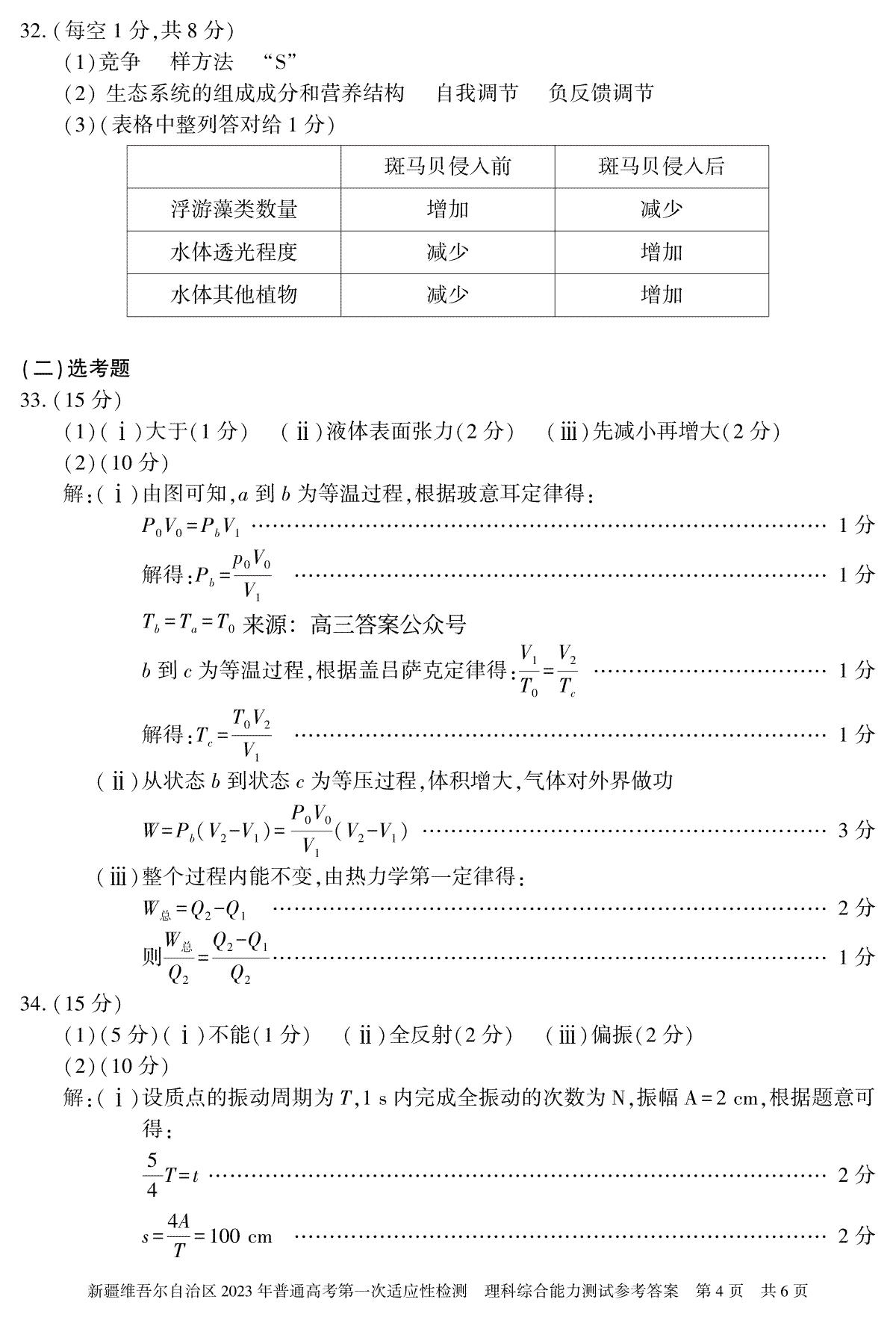 一、2023新疆一模高三理综答案 23年自治区适应性检测第一次