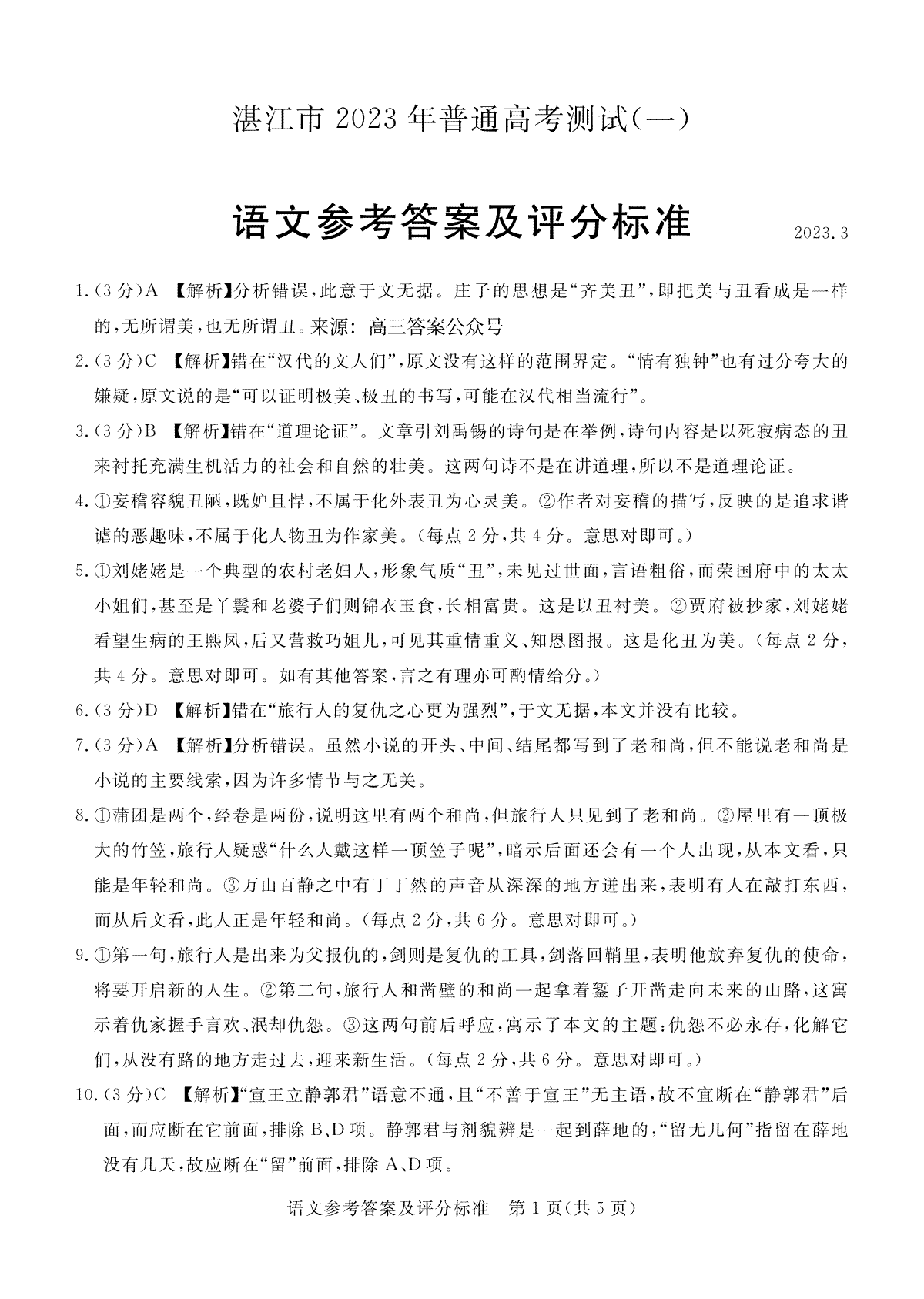 如果你想下载2023届广东省湛江市高三一模语文答案DOC或PDF版,请点击本文末链接!