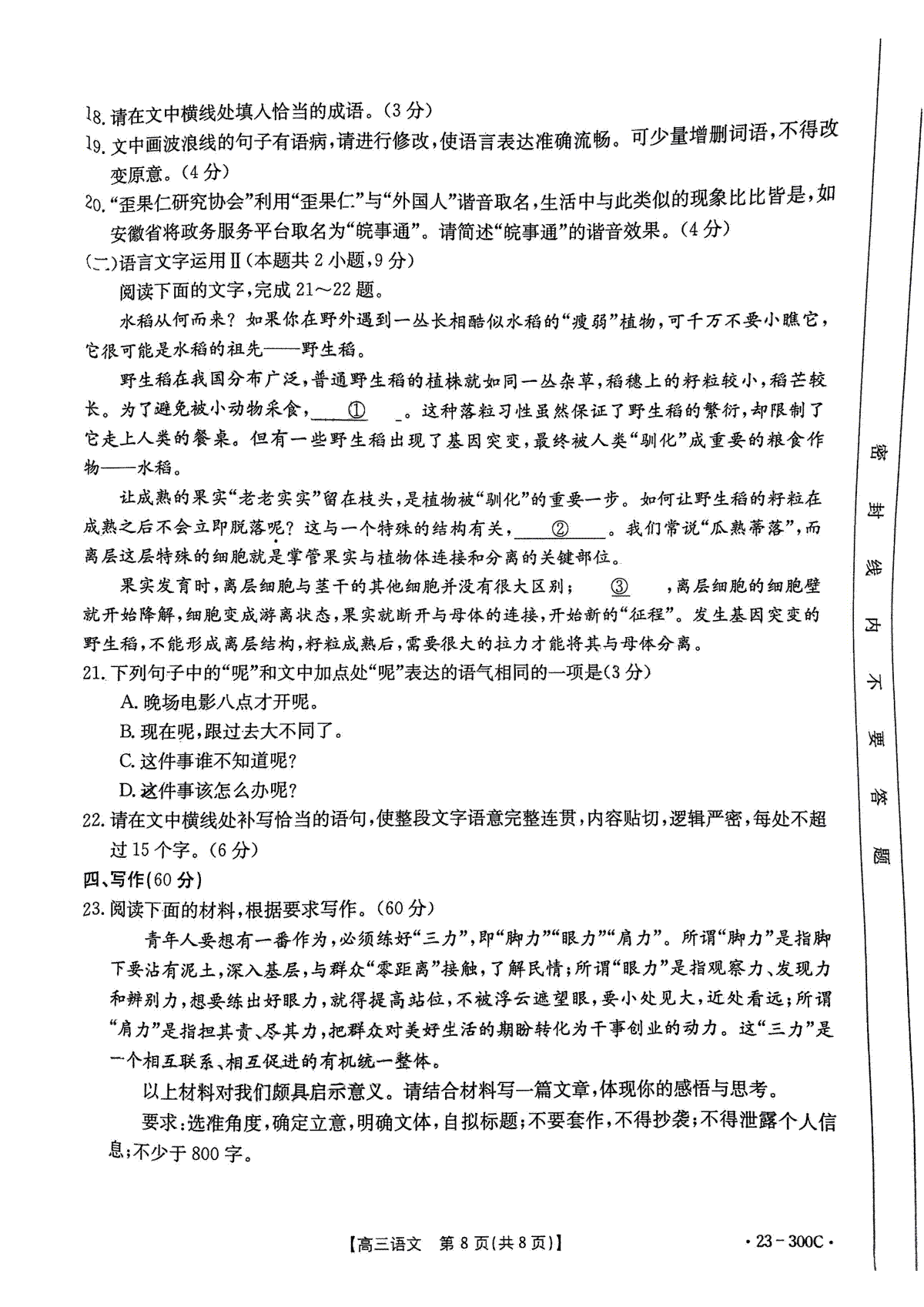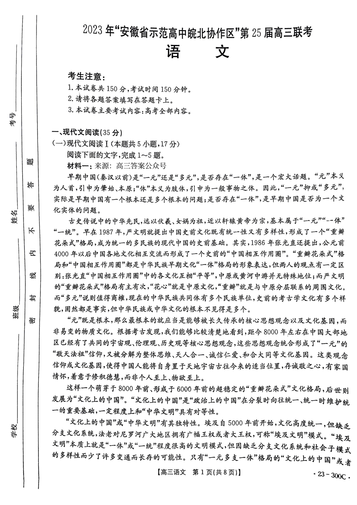 一、2023年安徽省示范高中皖北协作区第25届高三联考语文