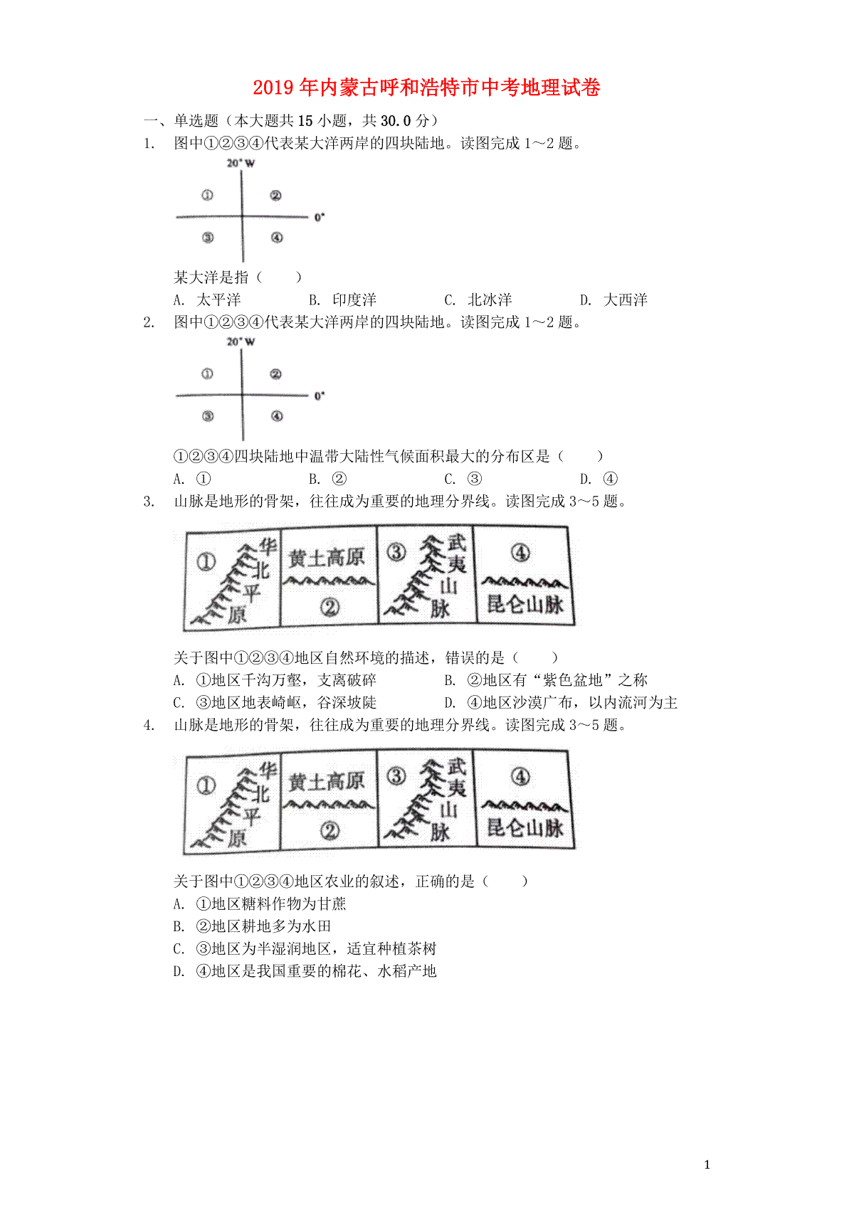 一、内蒙古呼和浩特市2019年中考地理真题试题(含解析)