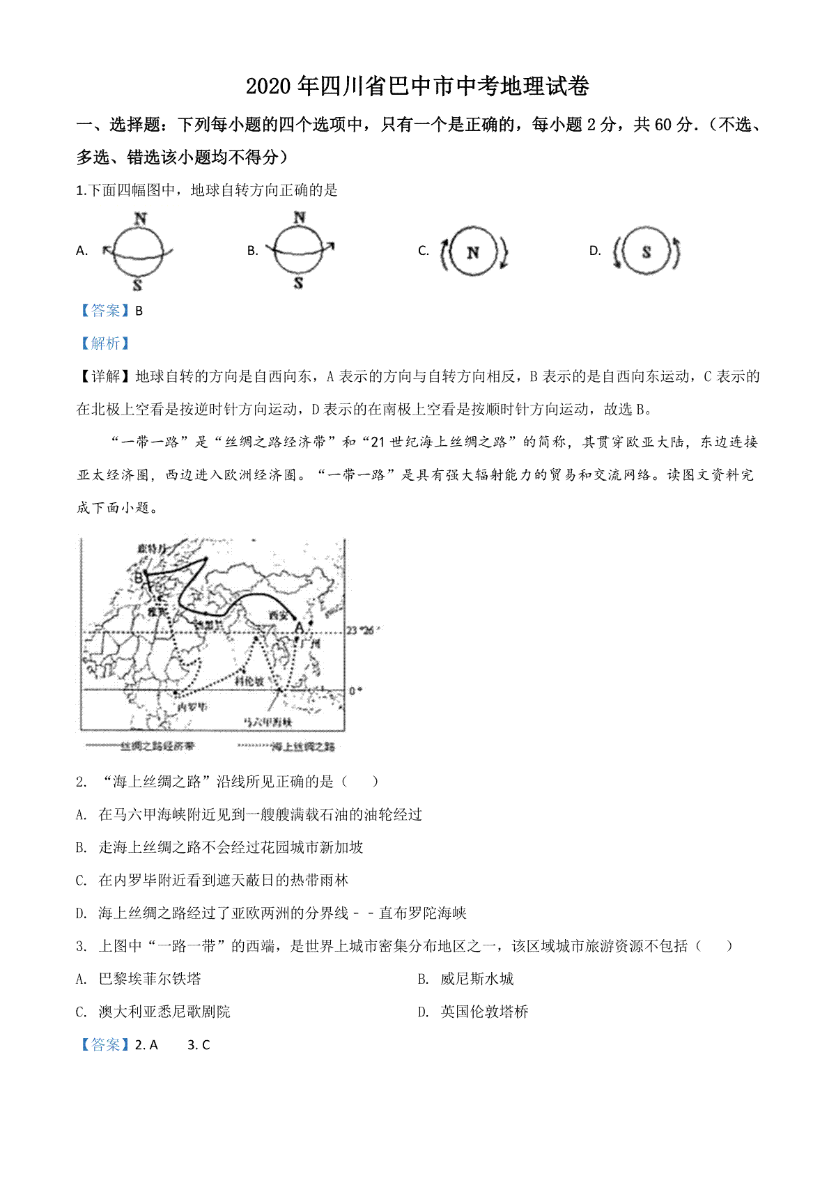 一、精品解析:四川省巴中市2020年中考地理试题(解析版)