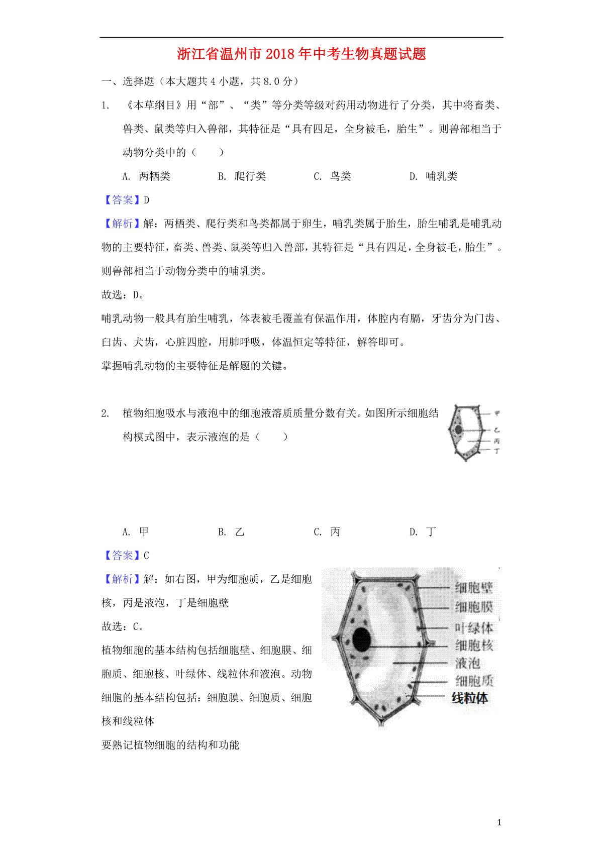 1.浙江省温州市2018年中考科学(生物部分)真题试题(含答案)