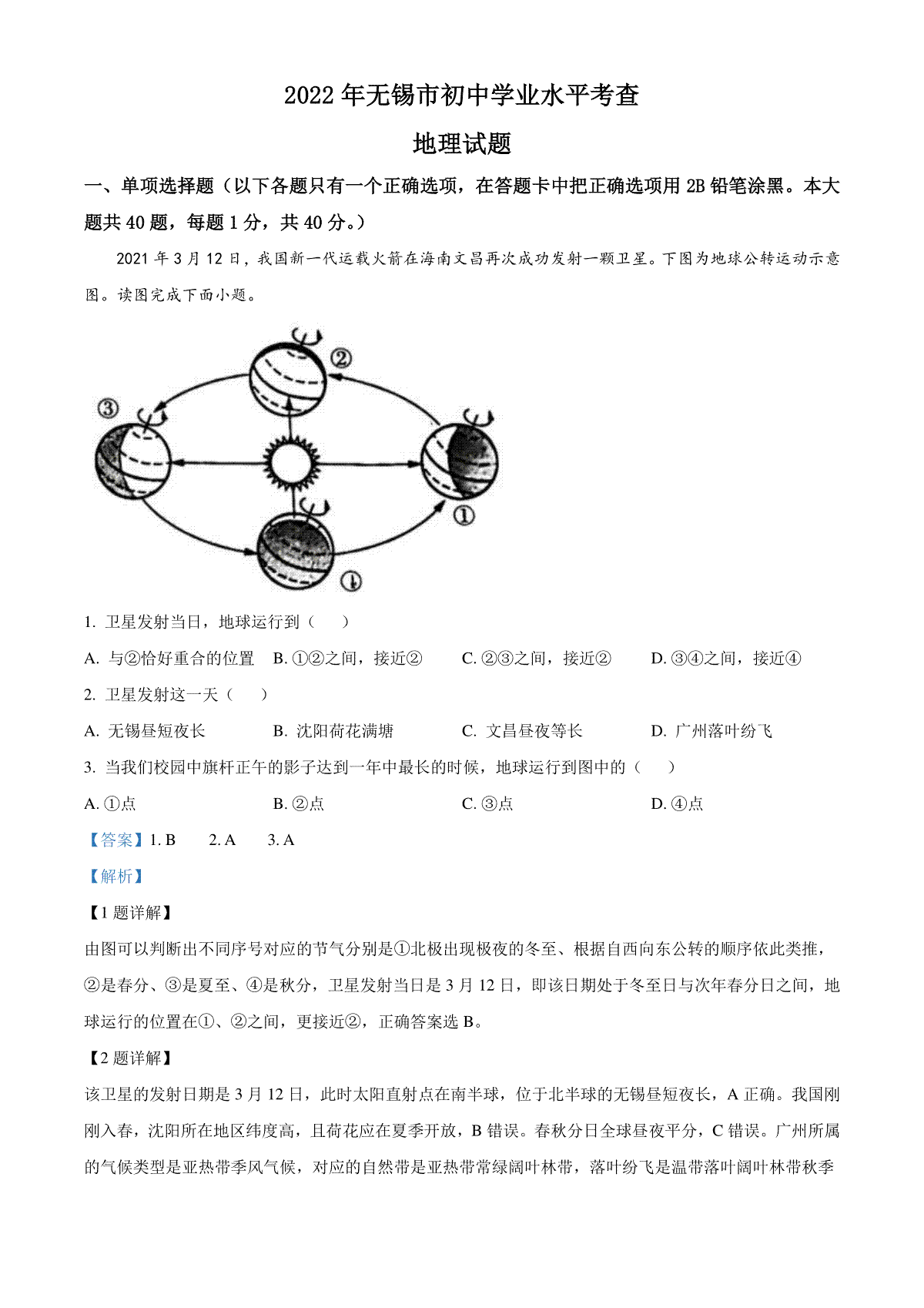 一、精品解析:2022年江苏省无锡市中考地理真题(解析版)
