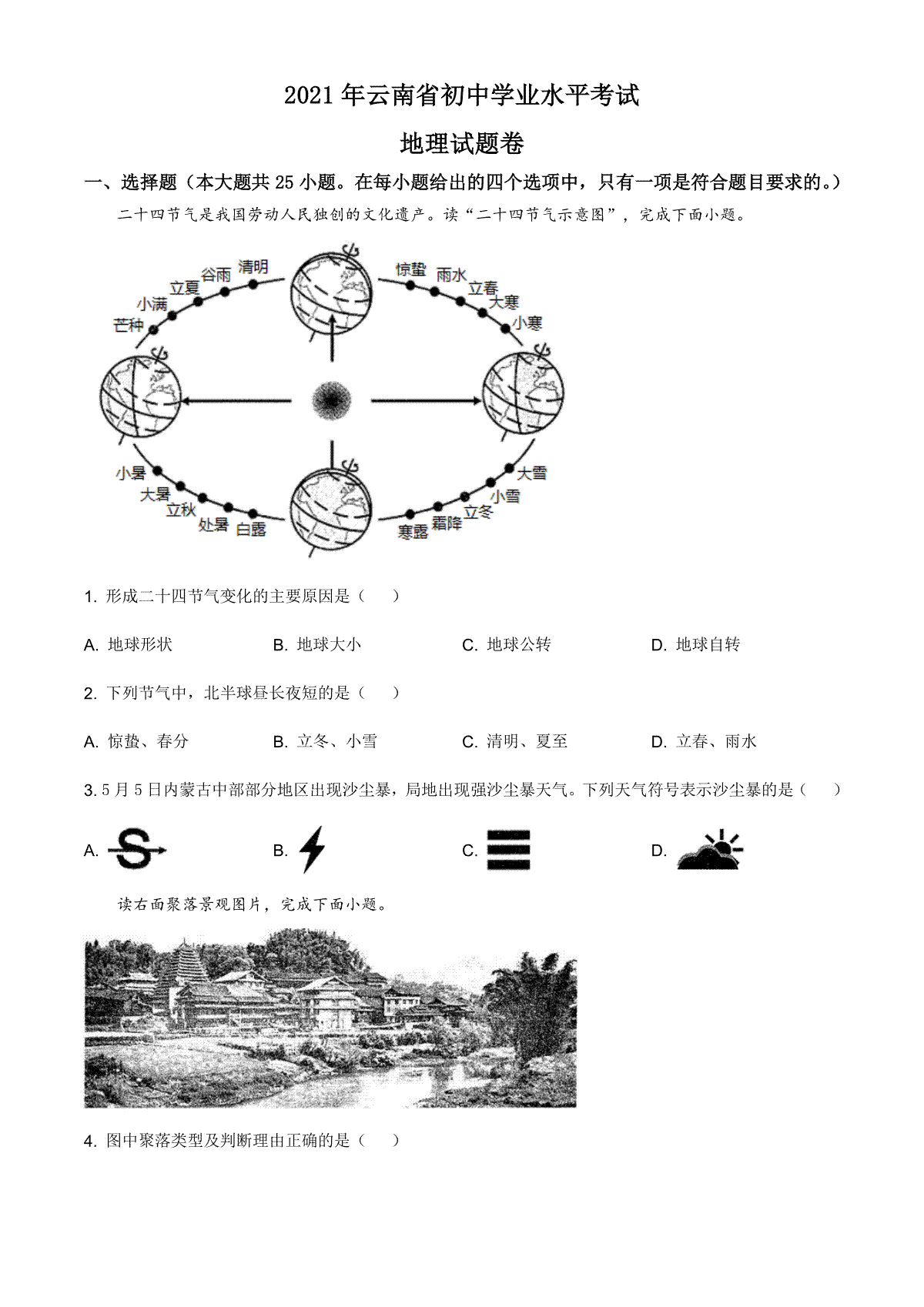 云南省2021年中考地理真题(原卷版)于近期开考,本次考试对考生对知识的掌握参考价值大,为了方便大家复习掌握错题!小编在下文为大家准备了云南省2021年中考地理真题(原卷版)试卷及答案解析详情,仅供考生参考。