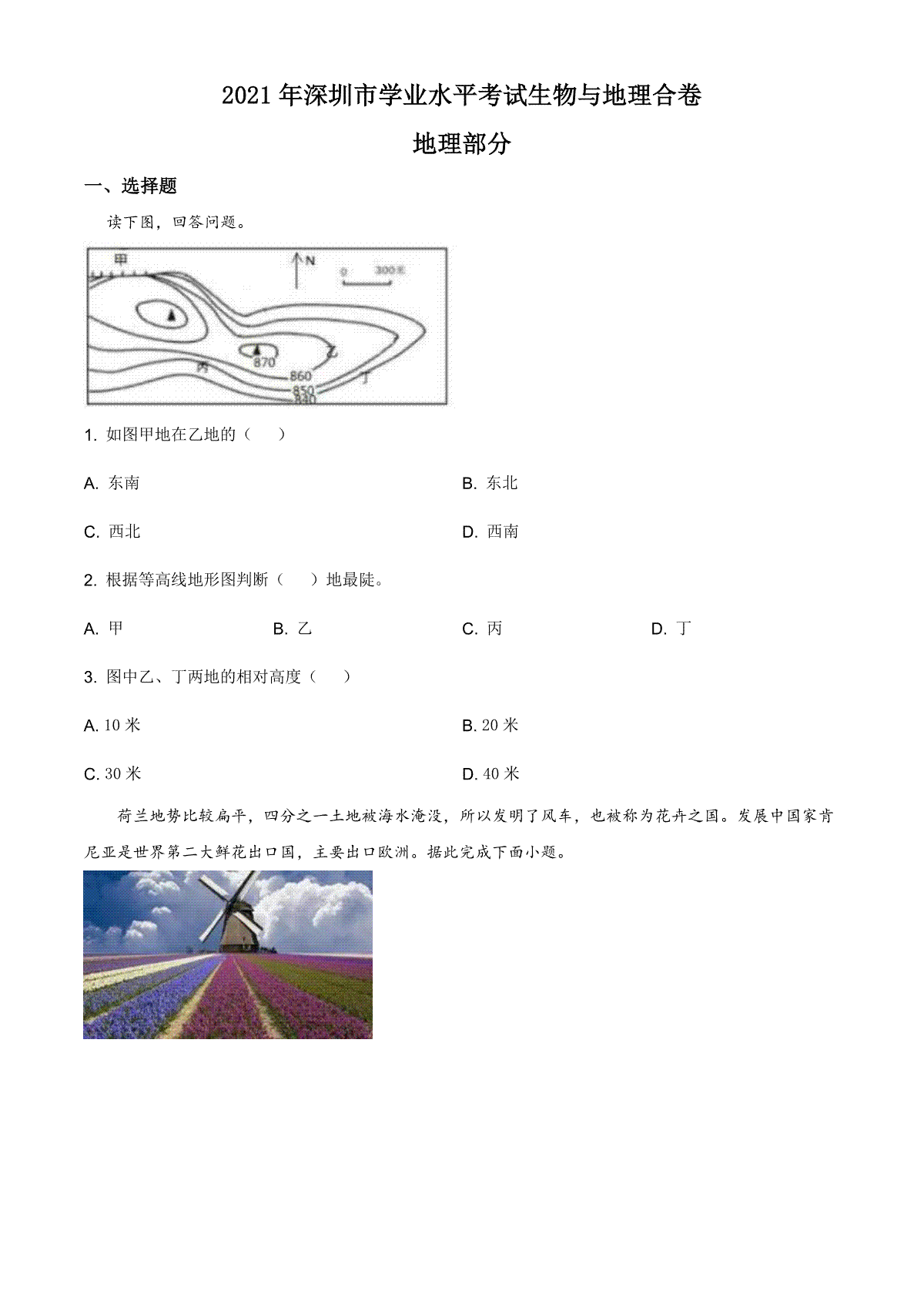 一、2021年广东省深圳市中考地理真题(原卷版)