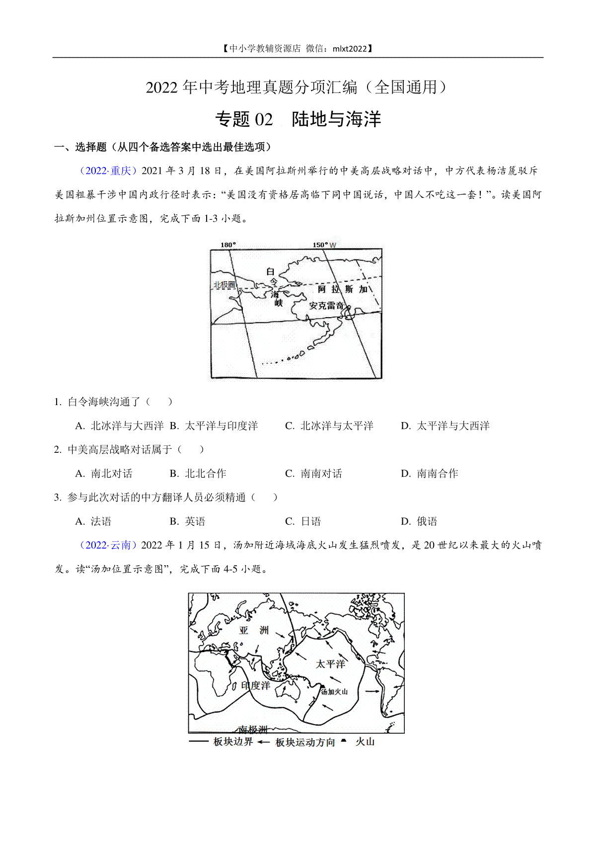 1.第1期专题02 陆地与海洋2022年中考地理真题分项汇编(全国通用)(原卷版)