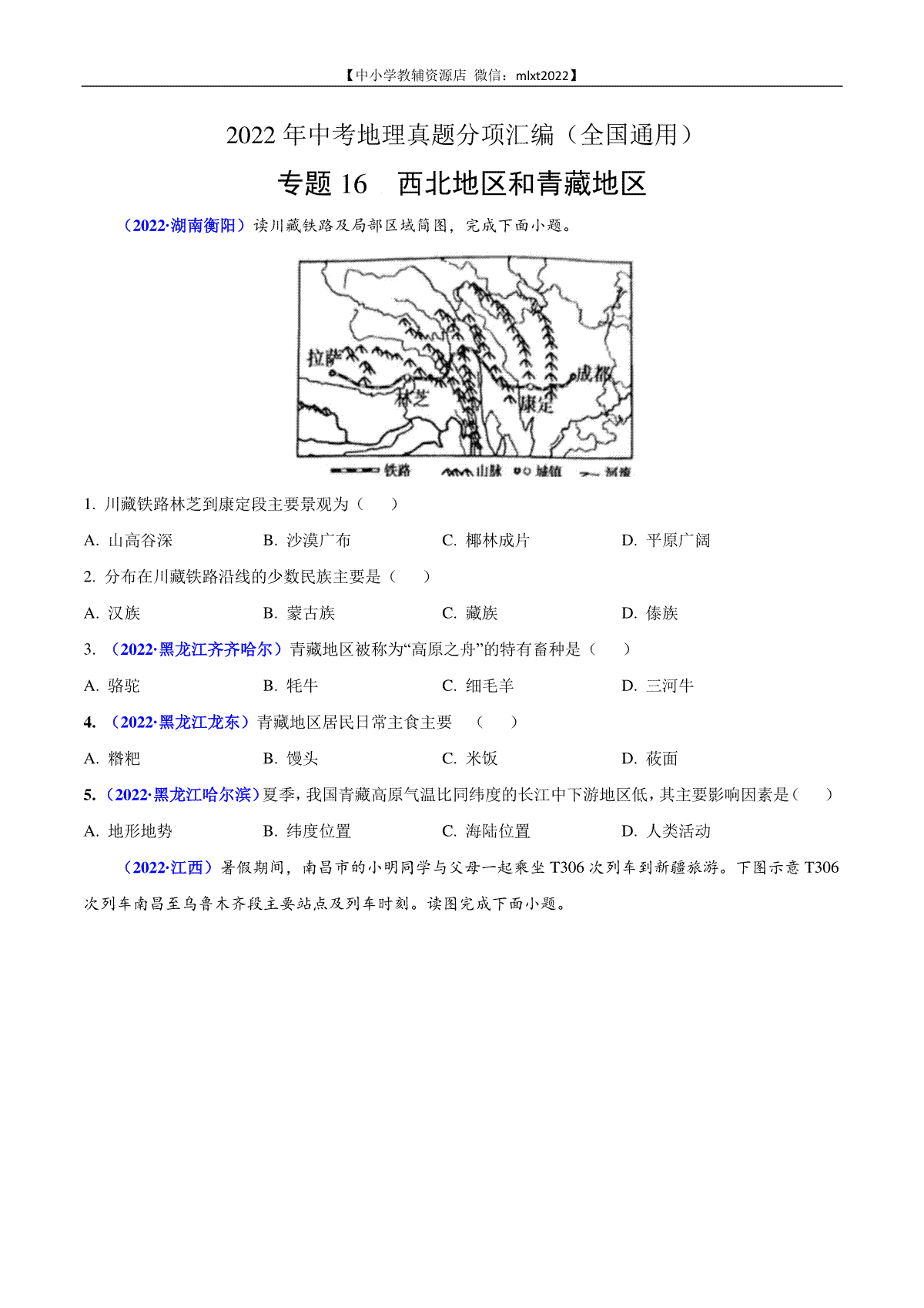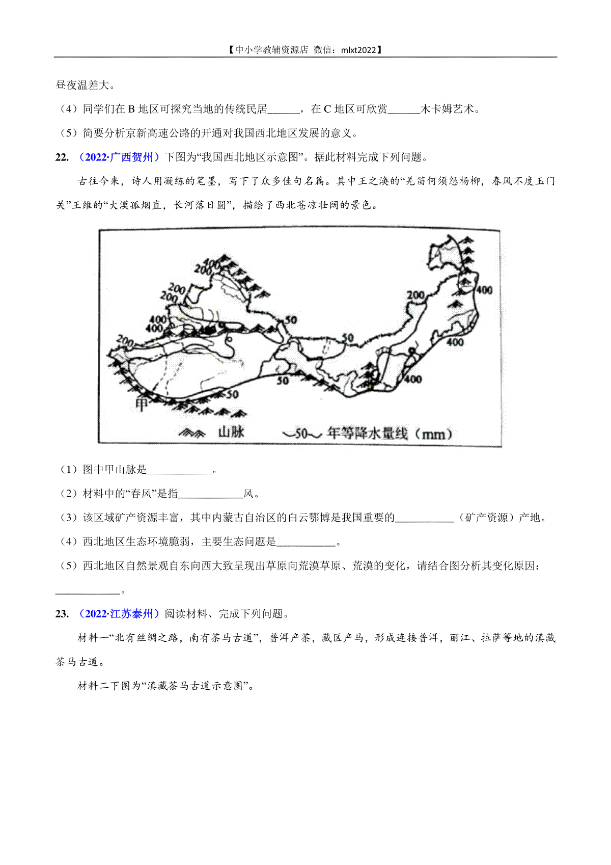 如果你想下载第2期专题16 西北地区和青藏地区2022年中考地理真题分项汇编(全国通用)(原卷版)DOC或PDF版,请点击本文末链接!