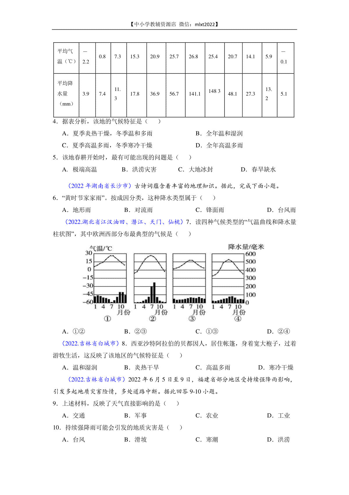 一、第3期专题03 天气与气候-2022年中考地理真题分项汇编(全国通用)(原卷版)