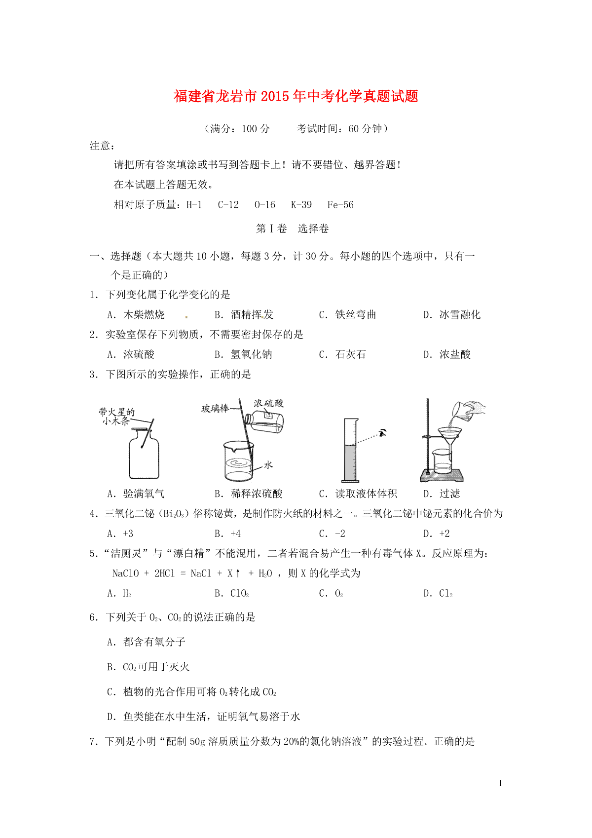 1.福建省龙岩市2015年中考化学真题试题(含答案)