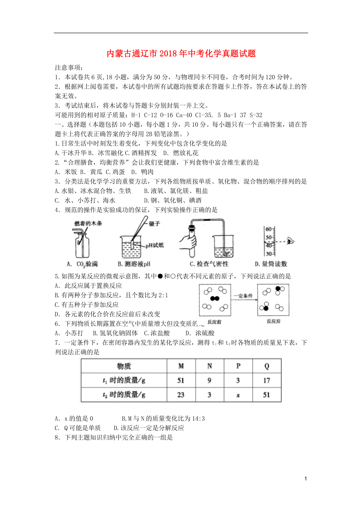 1.内蒙古通辽市2018年中考化学真题试题(含答案)