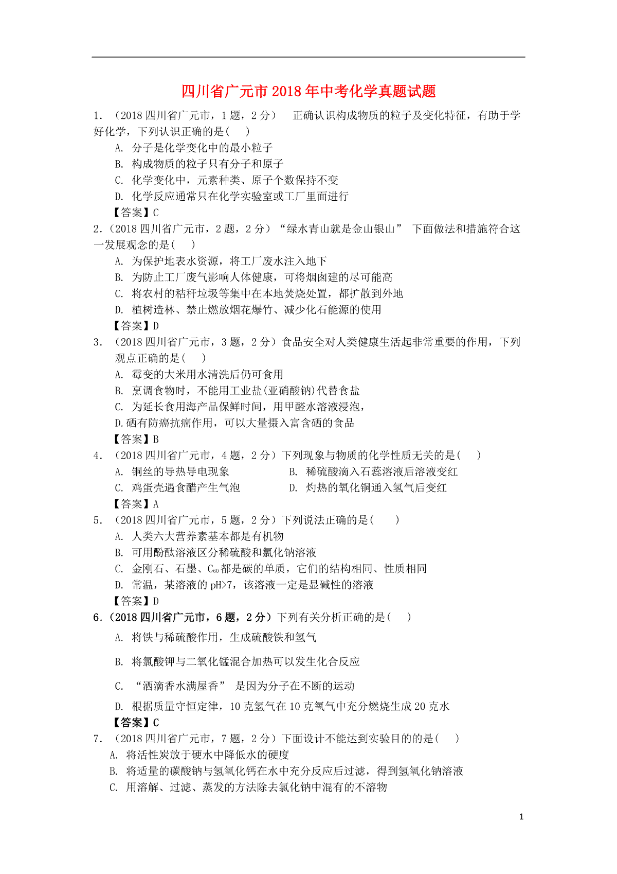 一、四川省广元市2018年中考化学真题试题(含答案)