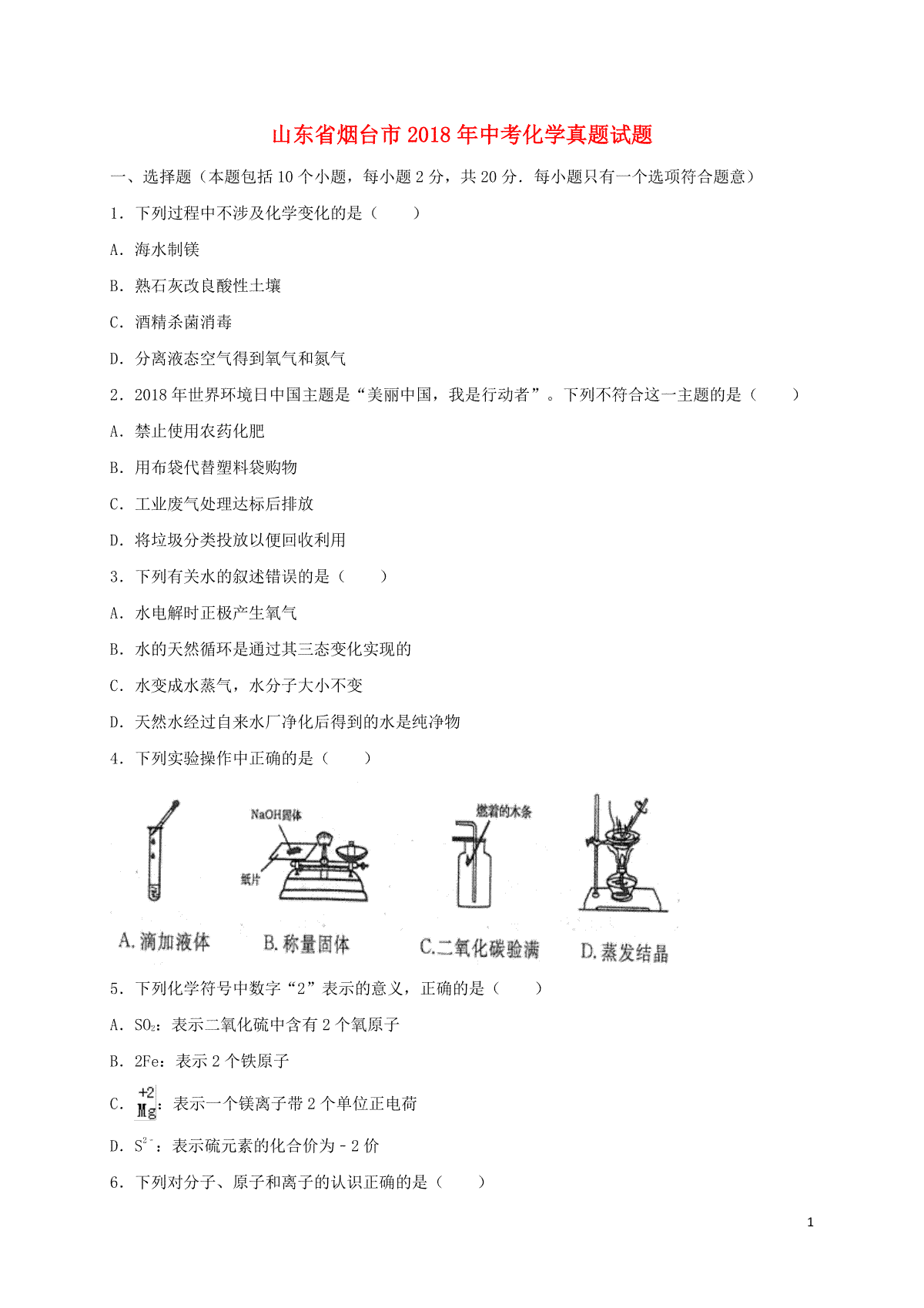 1.山东省烟台市2018年中考化学真题试题(含答案)
