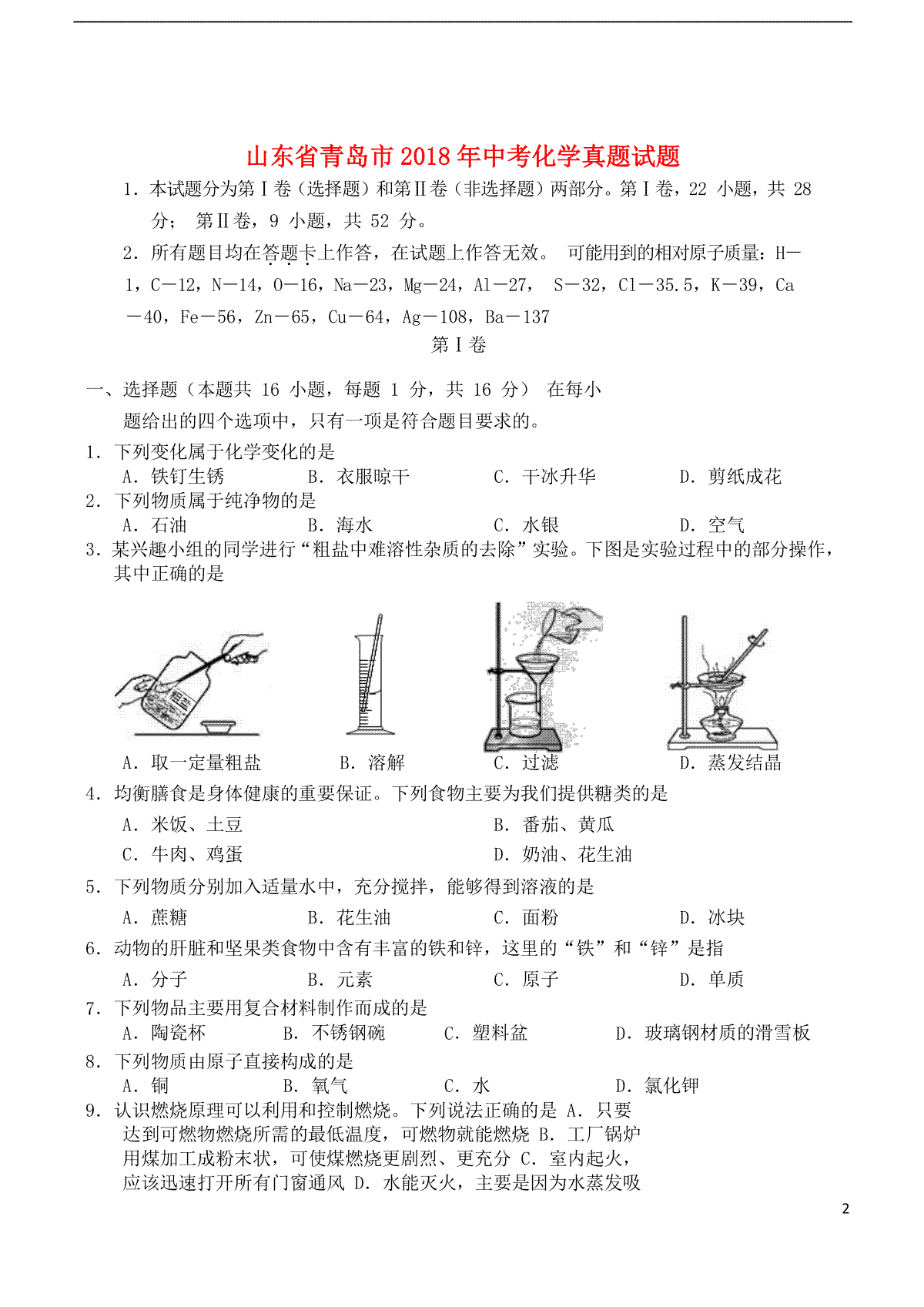 1.山东省青岛市2018年中考化学真题试题(含答案)