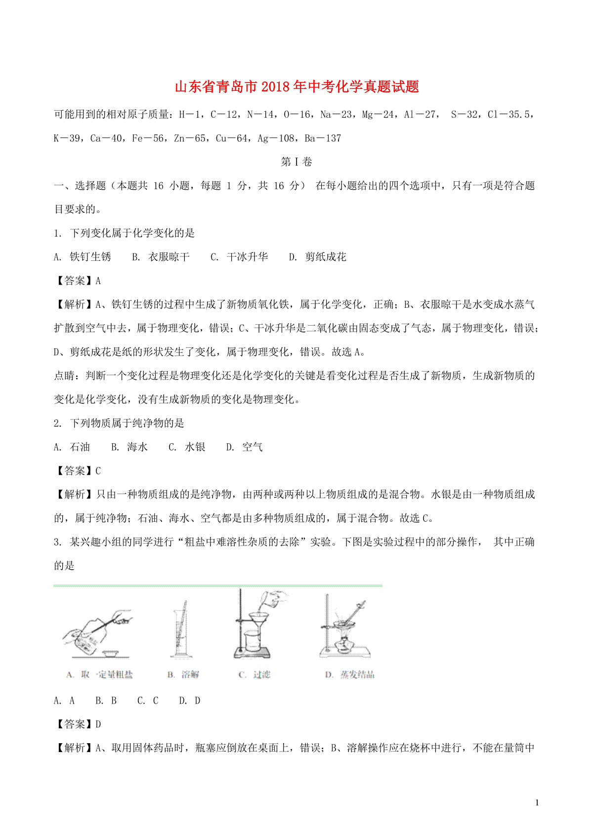 1.山东省青岛市2018年中考化学真题试题(含解析)