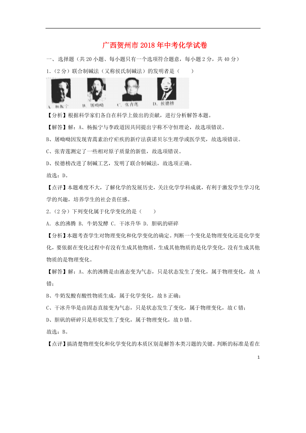 1.广西贺州市2018年中考化学真题试题(含解析)