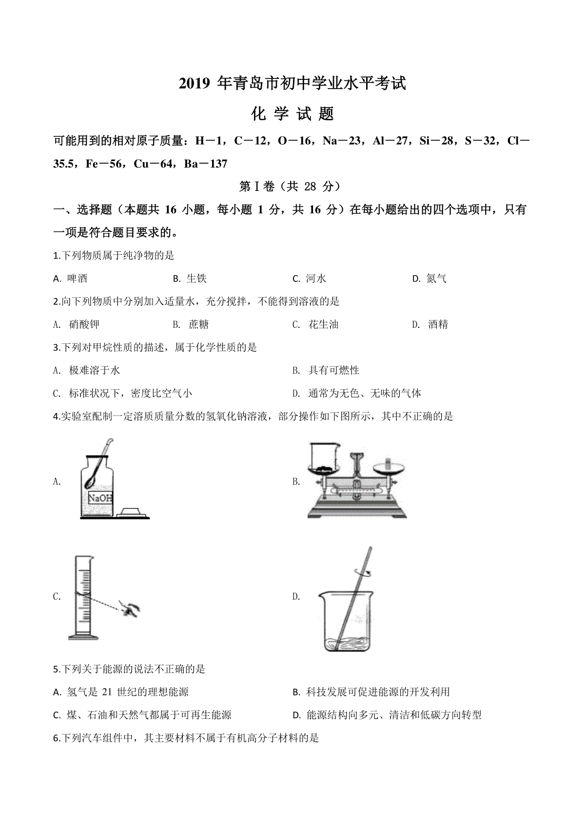 1.精品解析:山东省青岛市2019年中考化学试题(原卷版)