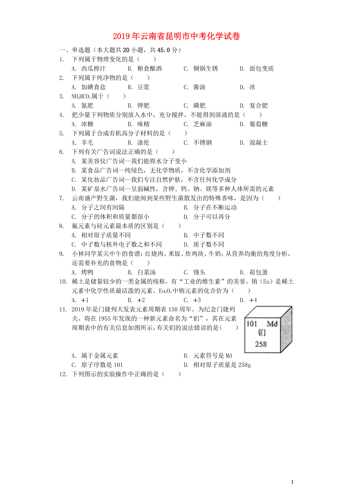 一、云南省昆明市2019年中考化学真题试题(含解析)
