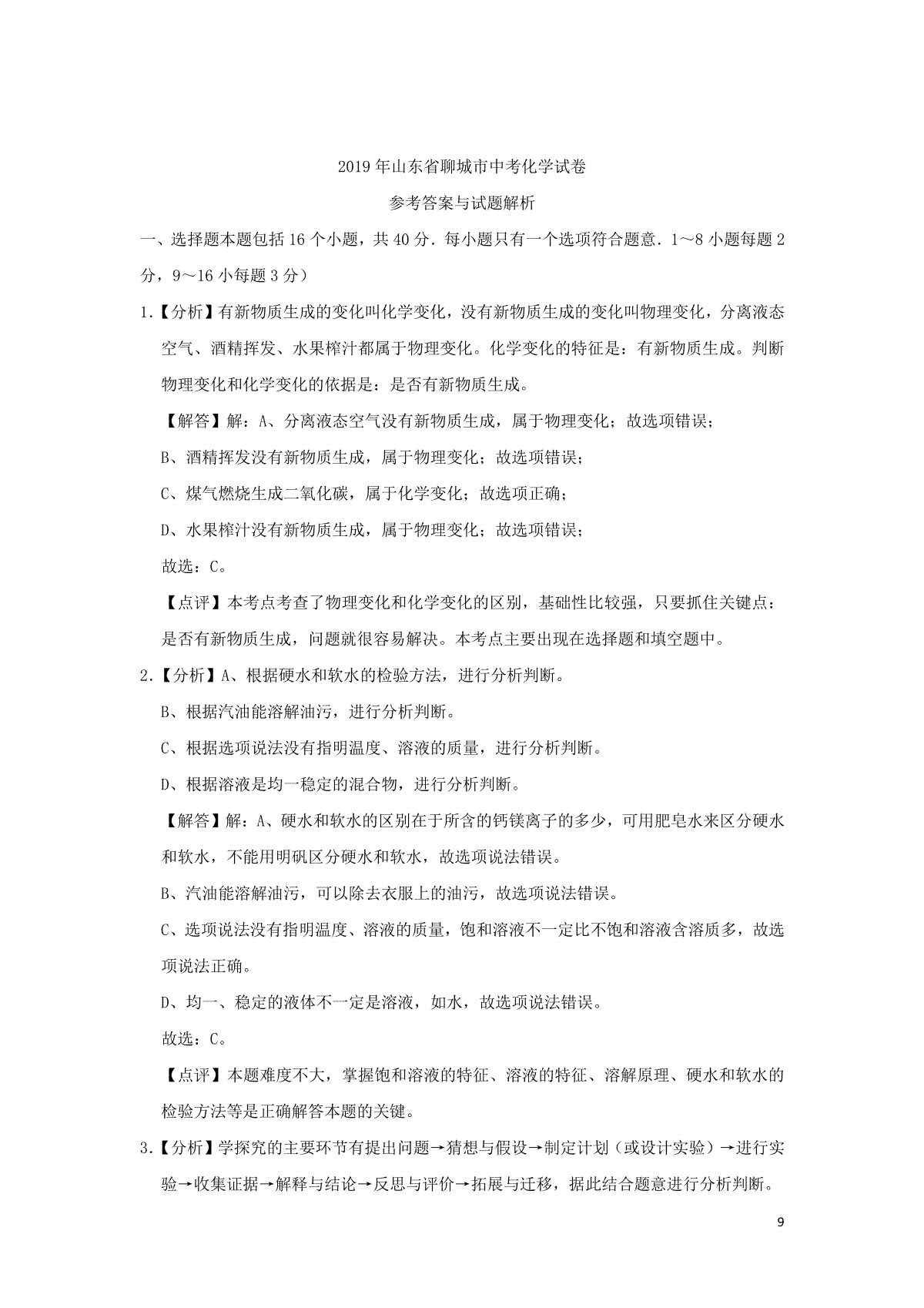 一、山东省聊城市2019年中考化学真题试题(含解析)
