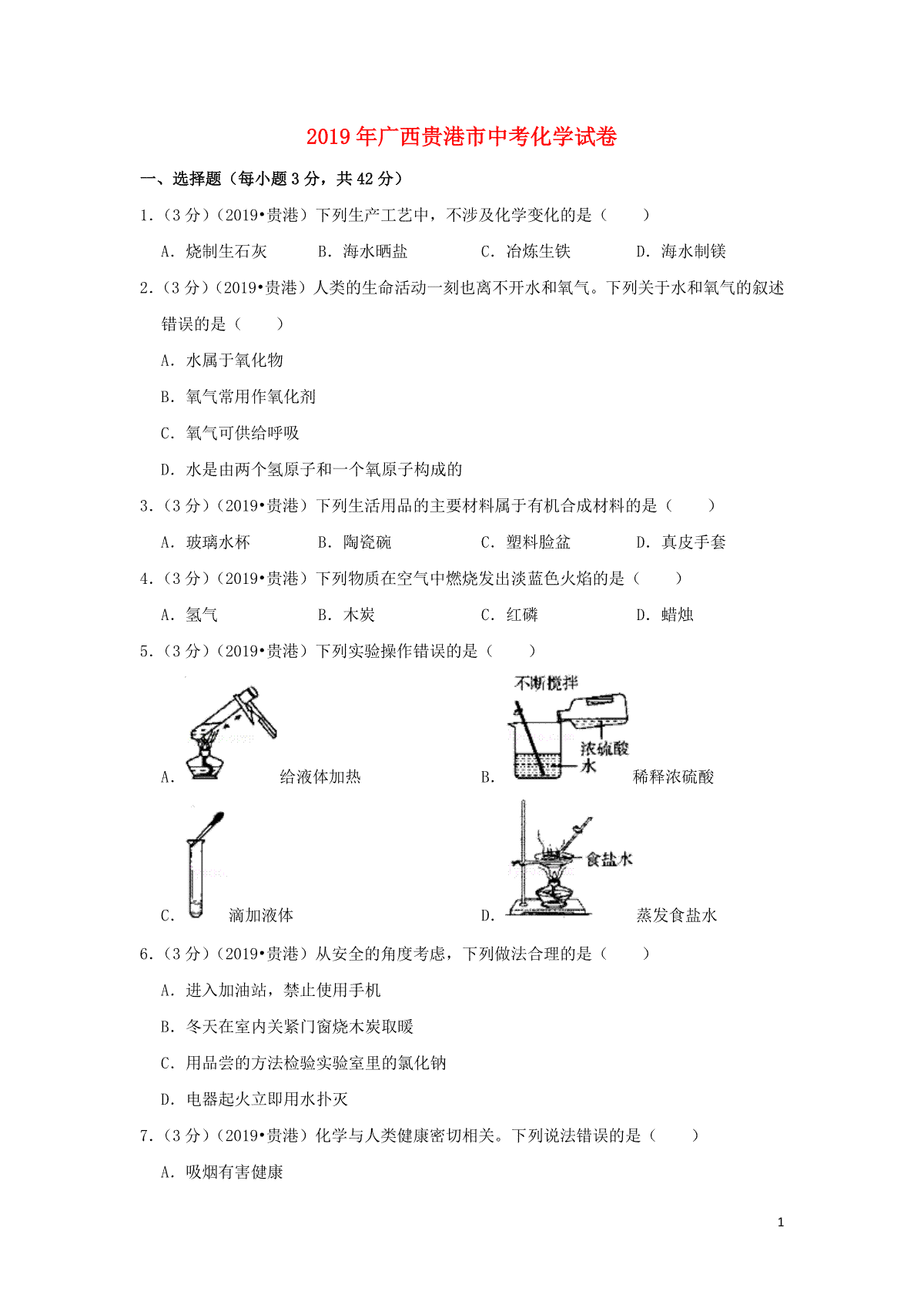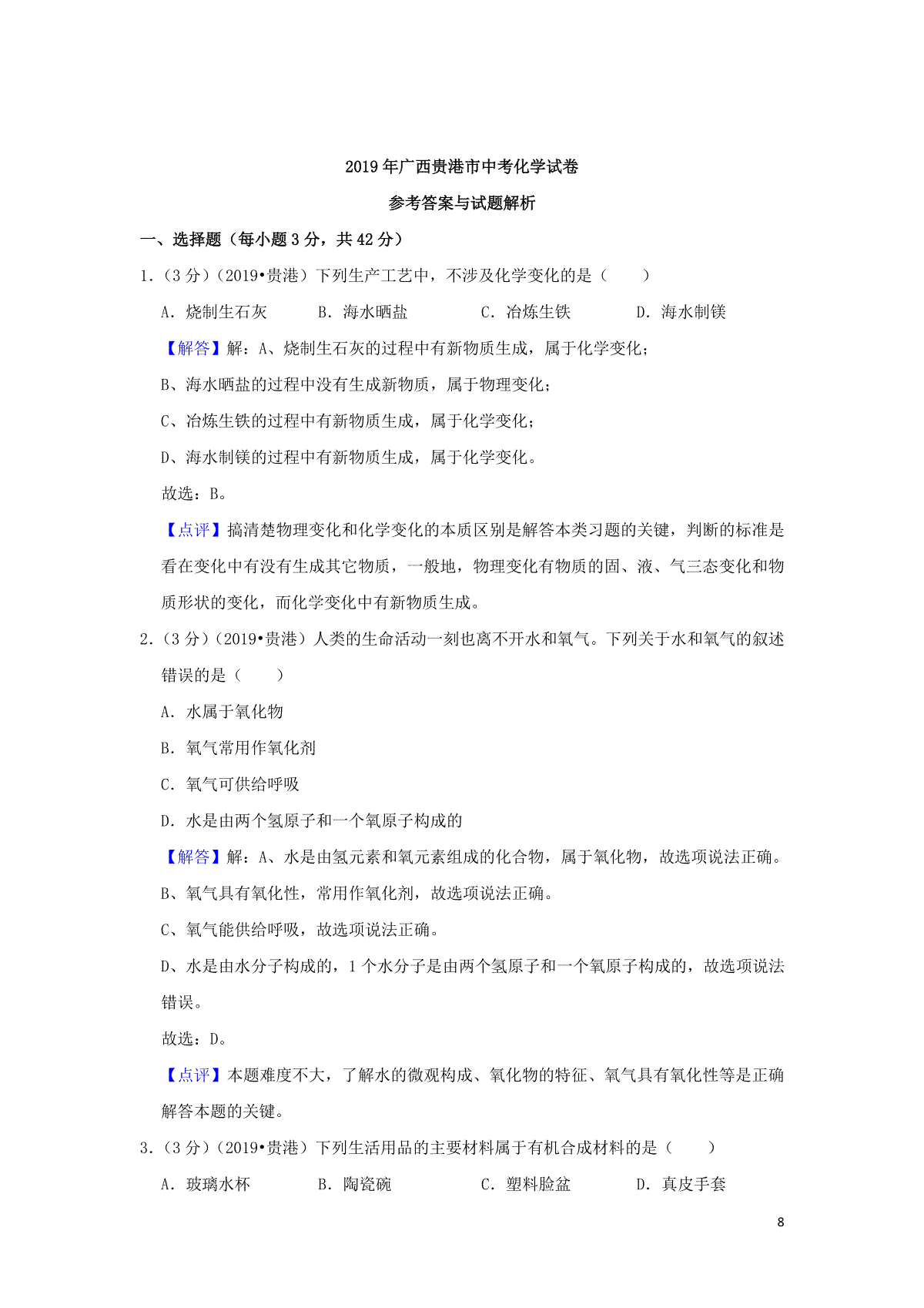 1.广西贵港市2019年中考化学真题试题(含解析)