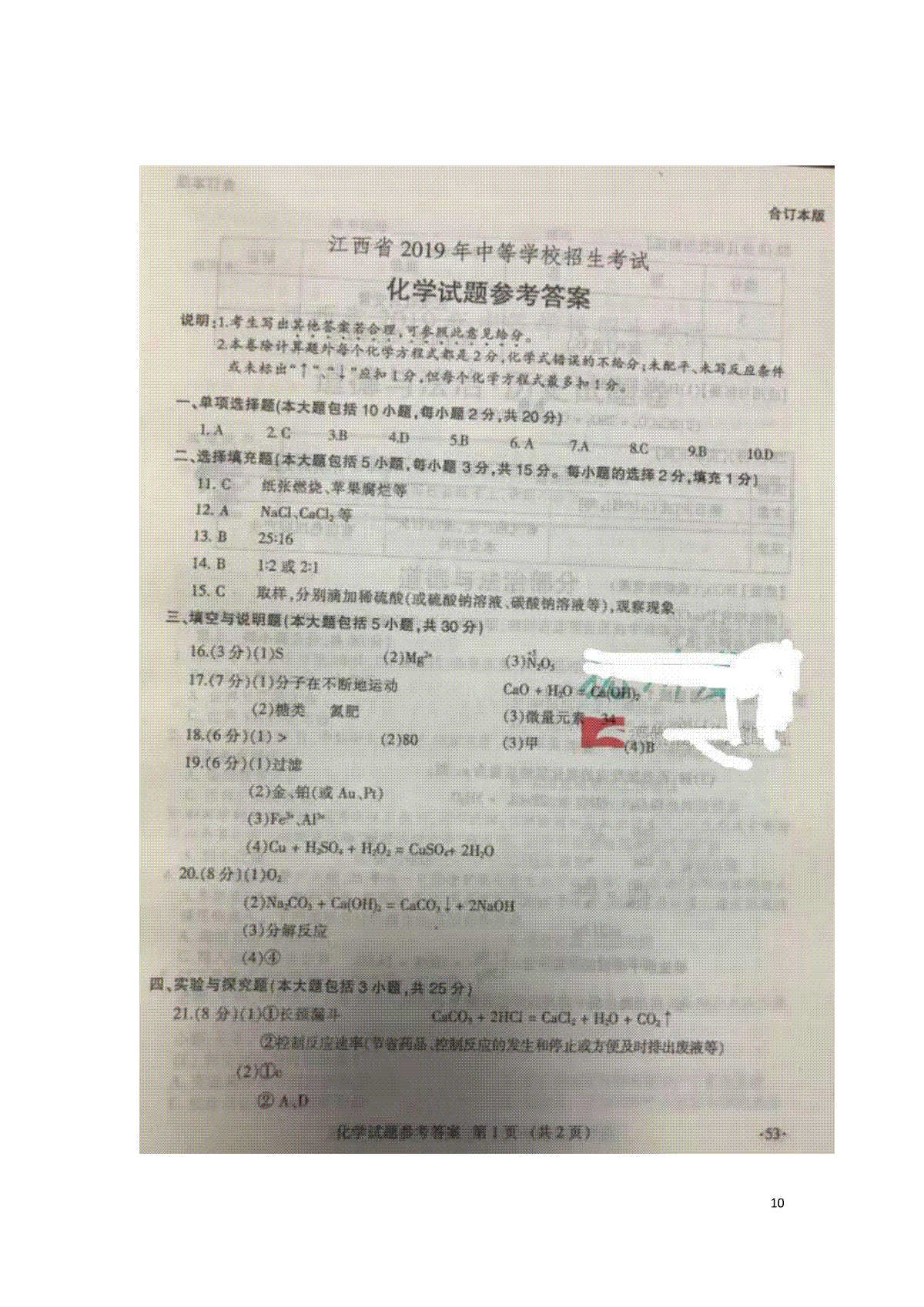 下载江西省2019年中考化学真题试题PDF格式或doc