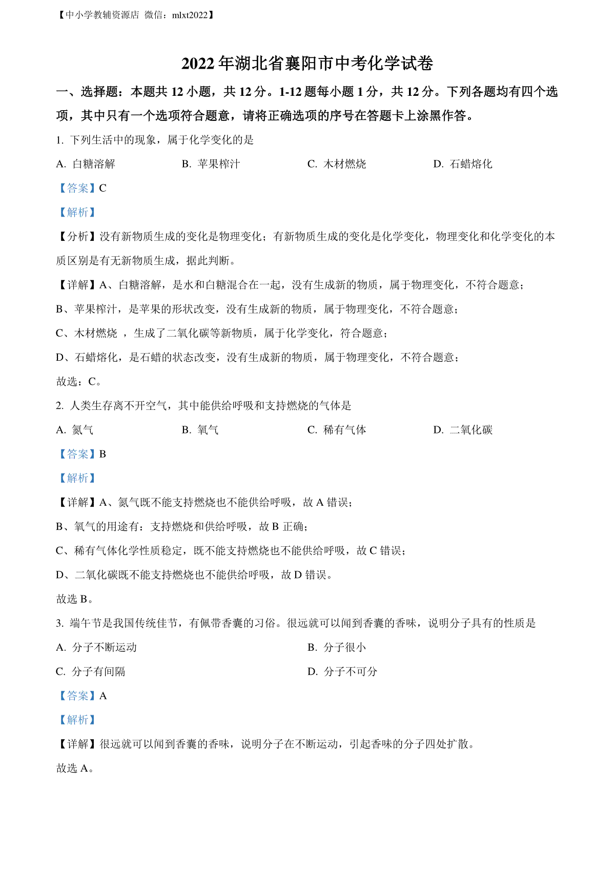 1.精品解析:2022年湖北省襄阳市中考化学真题(解析版)