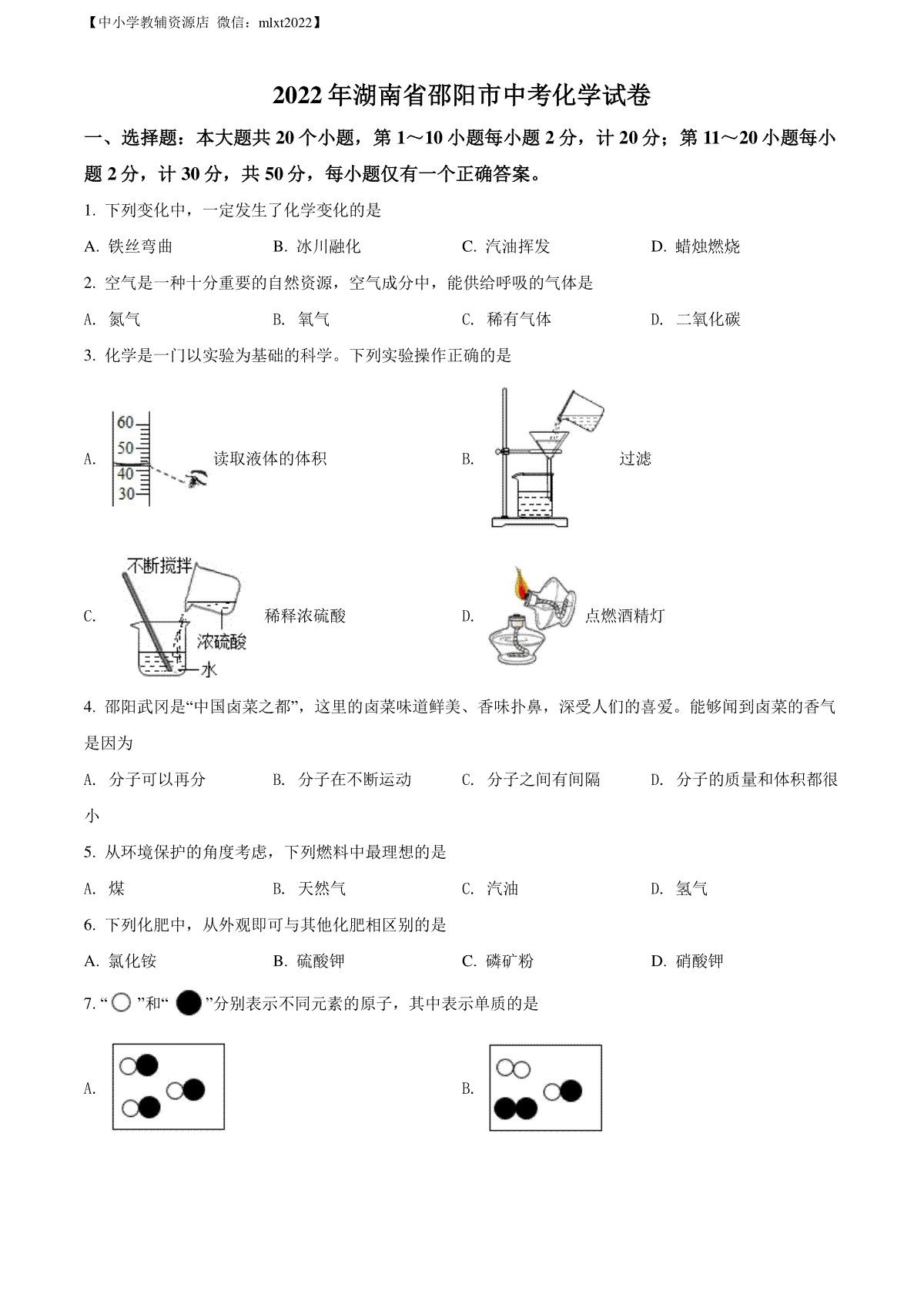 一、精品解析:2022年湖南省邵阳市中考化学真题(原卷版)
